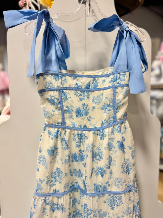 Peach Love Lt. Blue Contrast Shoulder Tie Floral Printed Maxi