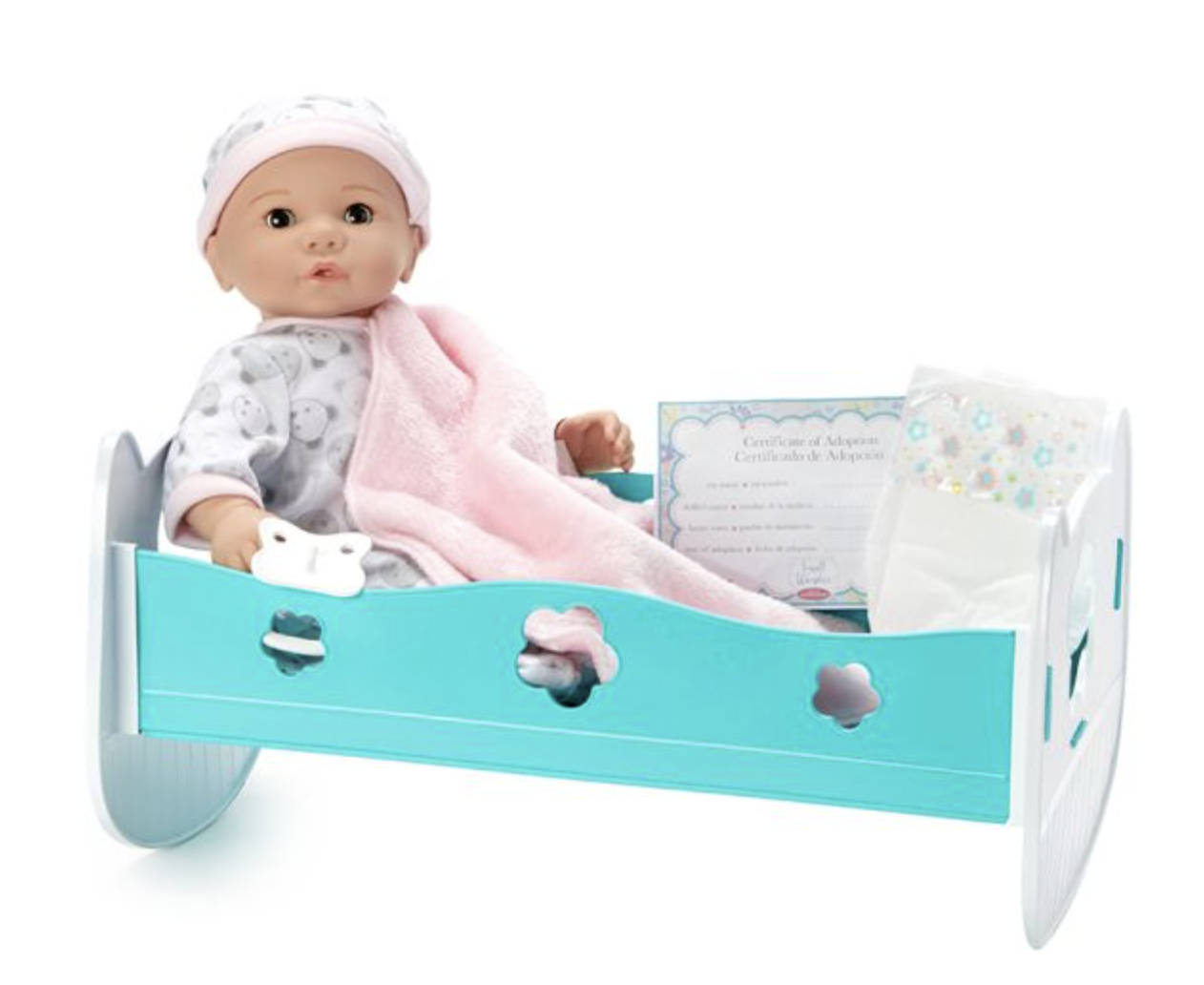 This adorable 14" baby doll is just waiting to be adopted and loved. Includes a cradle/changing table, blanket, pacifier, diaper and birth certificate to make it official. This little one has almost everything you need! For ages 3+