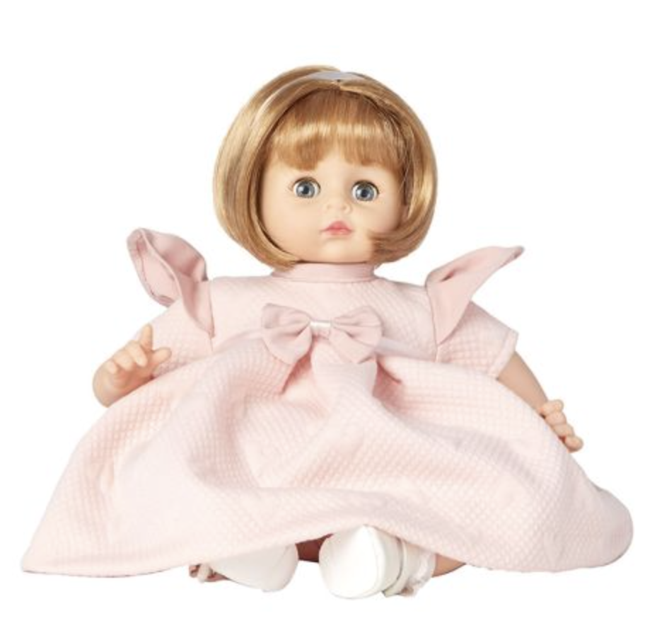 The 14” Pussycat- Pink Hearts doll has tosca hair, a light skin tone, and blue sleep eyes. She wears a beautiful pink matelassé heart pattern dress with a bow detail, a pink hair band, ruffled socks, and white shoes. The doll is a classic Pussycat collectible doll sculpt from Madame Alexander with a soft, cuddly fabric body with molded head and limbs.