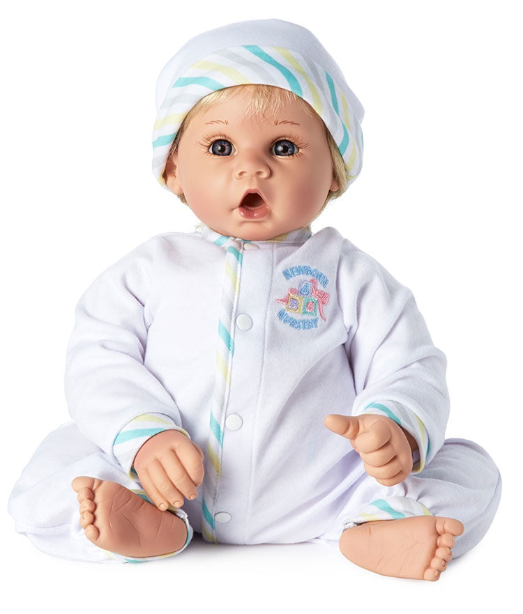 A nurturing doll from Madame Alexander's Newborn Nursery Collection.This sweet newborn features the Lee Middleton Little Sweetheart face sculpt. Little Sweetheart is designed to look and feel like a real baby. He has the softest vinyl limbs with subtle airbrushed coloration for realistic soft skin. He measures 19 inches long and his huggable cloth body is weighted for a more lifelike feel when you cuddle him. Little Sweetheart has blonde hair and blue eyes. He arrives wearing a sweet little onesie with soft pastel accents of color and a matching hat. Snap buttons allow for easy removal of his outfit. This is the perfect baby doll for any small child over the age of 3 or even grownups who are a child at heart. Arrives packaged in a Madame Alexander window box. Little Sweetheart 76000 is part of the Madame Alexander Collection.