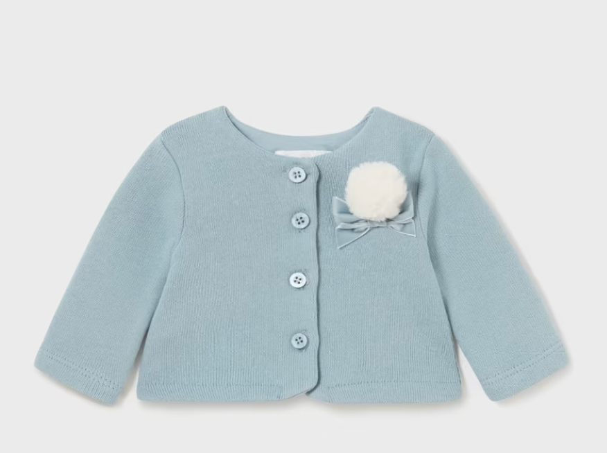 Jacket for newborn. Round neckline with ruffles. Button fastenings down the front. Decorative elements: bow applique, pompom