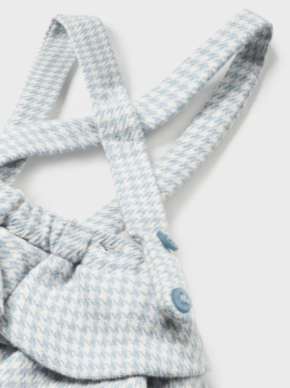 . Dungaree skirt for newborn. Snap button closure at crotch for easy putting on and taking off. Elastic waistband. Ruffled design. Patterned design.