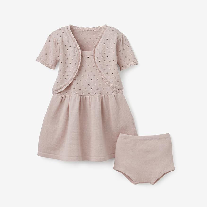 Blush Pointelle Knit Baby Dress, Sweater, and Bloomer Set