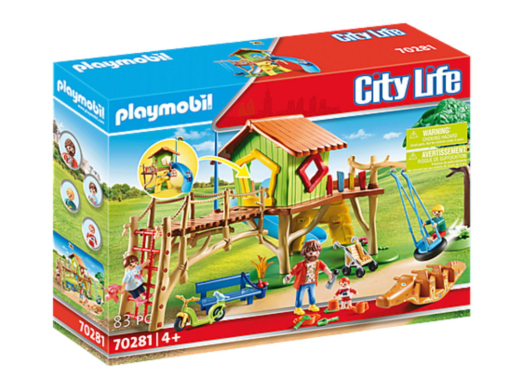 What could be nicer than romping and playing outside in the fresh air? The Adventure Playground offers everything that little bundles of energy need to have real fun. Slide, tire swing, climbing wall, of course all playground equipment has to be tested properly. Children's favourite is the great crocodile seesaw, on which they can bounce and swing for hours. While the children play, daddy makes himself comfortable on the bench. The play set contains four PLAYMOBIL figures, a playground with climbing house, slide, tire swing, climbing wall, bench, crocodile seesaw, scooter, buggy and many other extras.