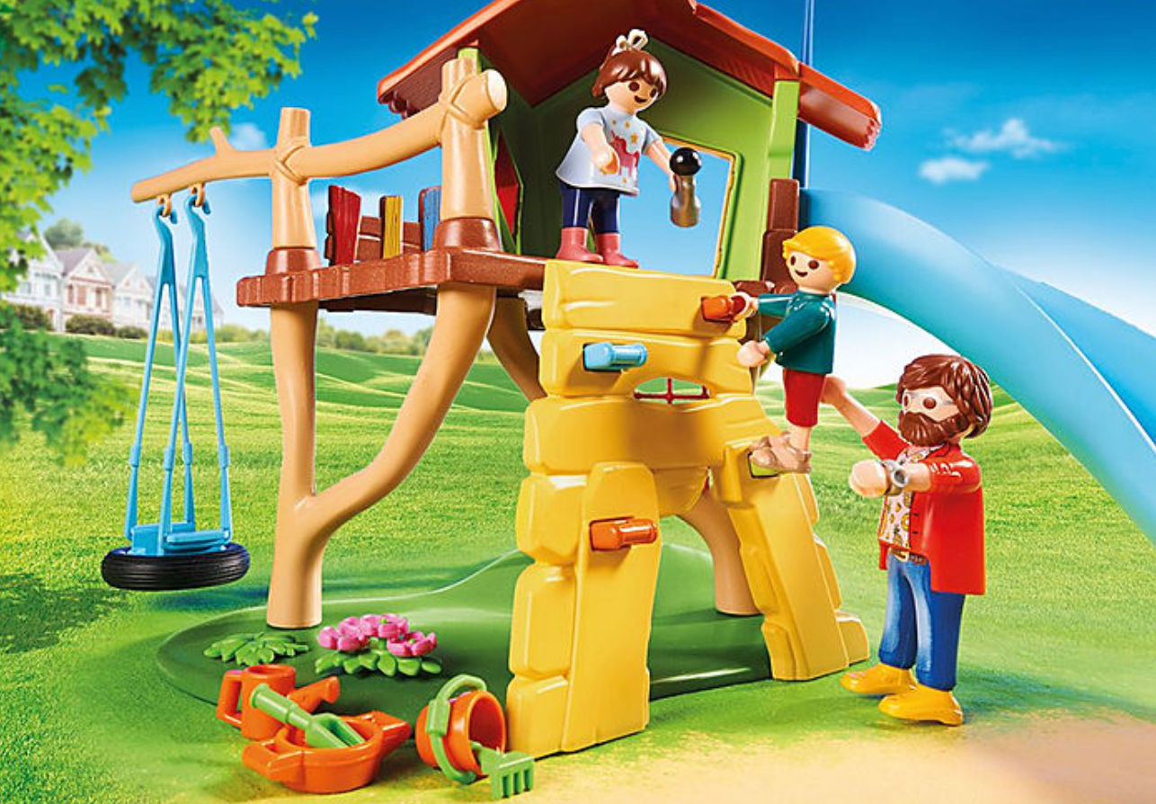 Figures: 1 man, 1 girl, 1 boy, 1 baby Animals: 1 butterfly, 1 bird Accessories: 1 playhouse with climbing net, climbing wall, slide and swing; 1 crocodile seesaw, 1 tree, 1 bench, 1 wheel, 1 buggy, 1 flagpole with flag, 1 sand bucket, 1 sand shovel, 1 sand rake, 1 sand sieve, 1 watering can, 1 teddy bear, 1 shoulder bag, 1 apple, 1 water bottle, 1 hair bow, 1 beard.