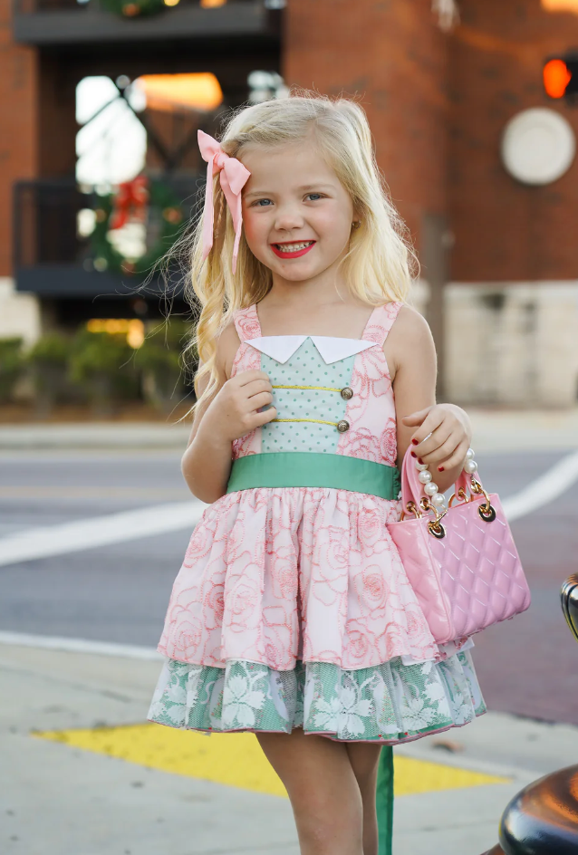 - rosette woven fabric accompanied by a layer of lace and woven printed fabric skirt