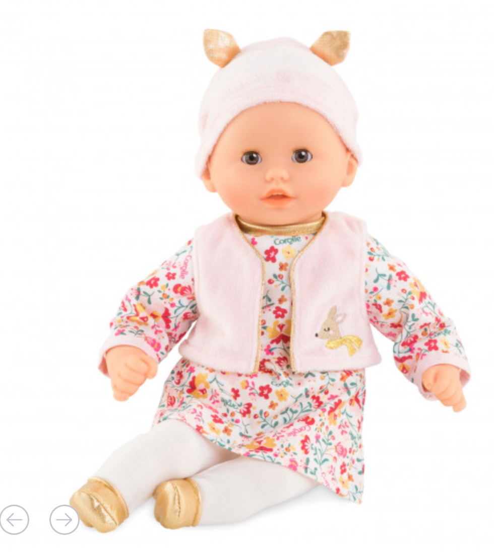 Bébé Calin Marguerite Blossom Winter is dressed in a charming flowered dress with a matching cap and is part of the mon premier poupon Corolle collection of dolls, clothing and accessories for beginning doll play.