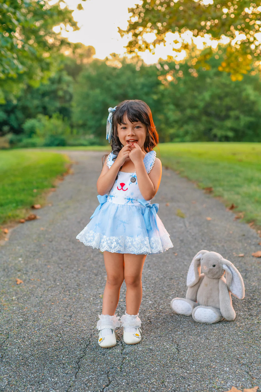 - Bunny face on bodice, button eyes and embroidered nose and mouth