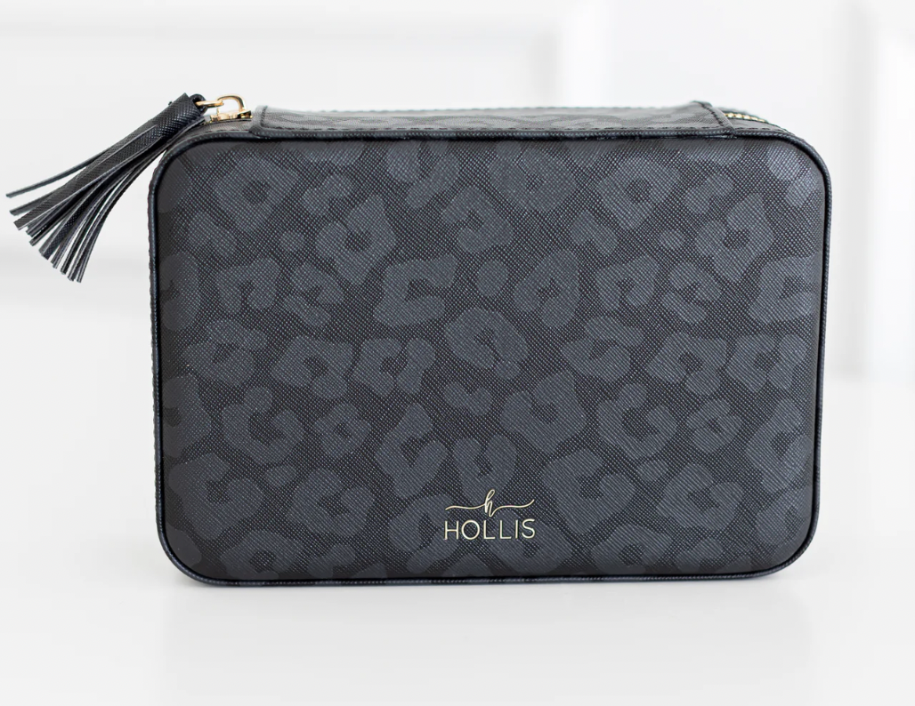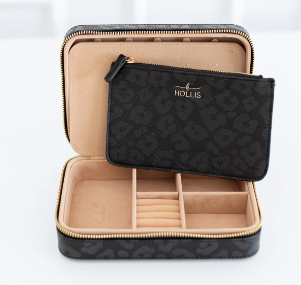 Travel with ease and keep your jewelry organized with our timeless jewelry organizer. Designed to store necklaces, bracelets, earrings, and rings in a display-worthy fashion, this organizer ensures your precious accessories remain tangle-free and protected. Available in our six iconic colors - Leopard, Blush, Nude, Metallic Mocha, Hot Pink, and Pixie Pink - you can select the one that suits your style best. Measuring at 8"x5.5"x2.5", this compact and versatile organizer is the perfect travel companion. Choose functionality and elegance with our jewelry organizer and embark on your next journey worry-free.