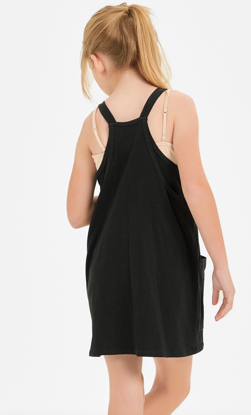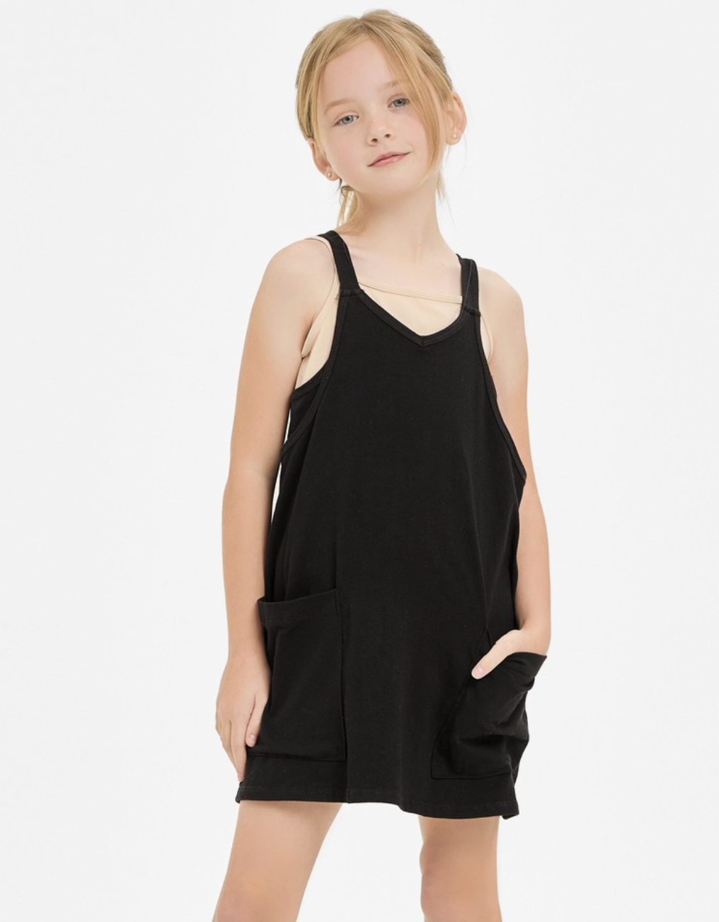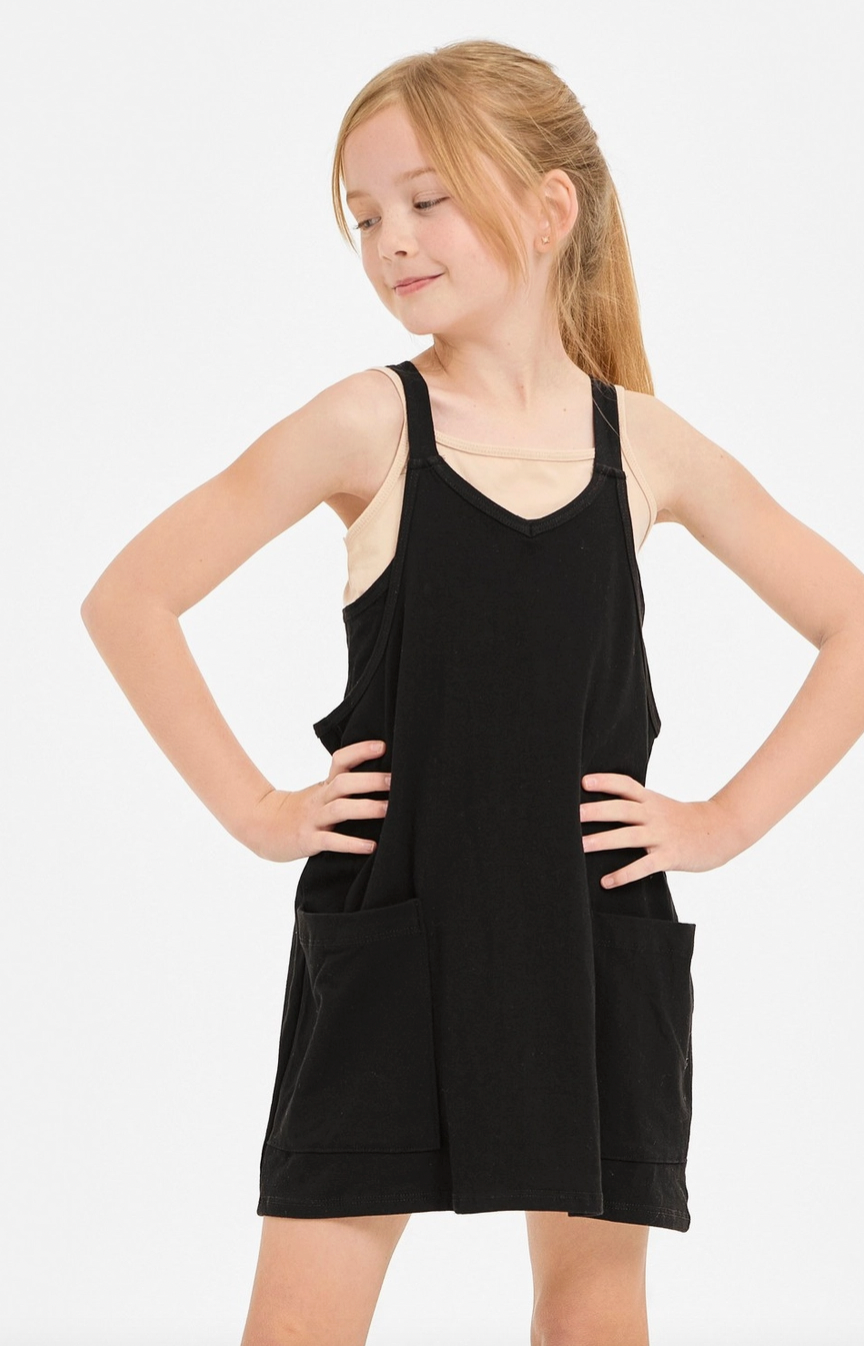 - Light-weight cotton jersey knit fabric - Sleeveless with shoulder cami strap - Two pockets on front - Cami dress with inner romper design.