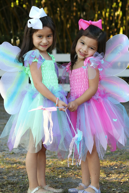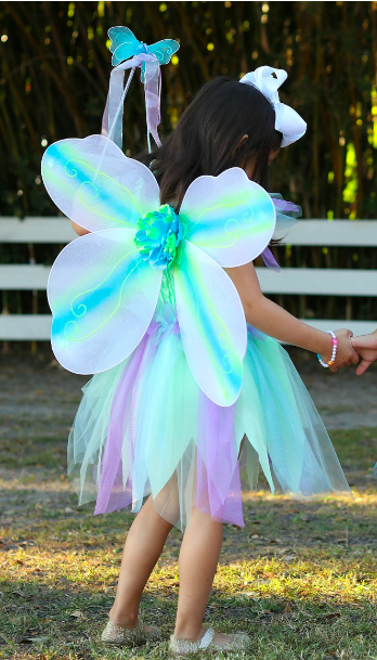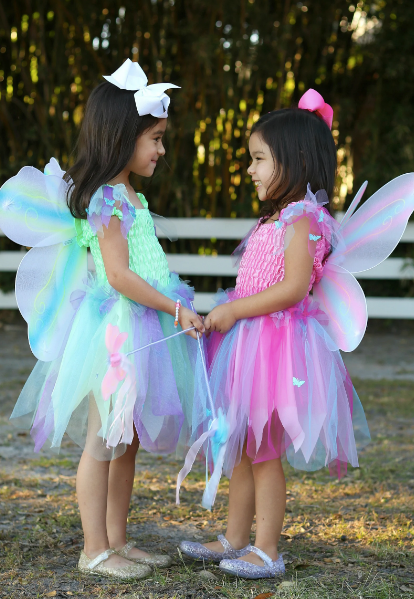 Great Pretenders™ Butterfly Dress, Wings, and Wand 3-pc Set. This beautiful dress, wings, and wand set will transform all little fairies to a wonderful land of fantasy and imagination. The bodice is fully ruched satin and provides comfort and size flexibility. The skirt features layers of sparkly petals adorned with iridescent butterflies and is fully lined. Adorable 4-pc wings are very comfortable to wear because they come with satin covered elasticized straps. A matching wand completes the look to work the magic! Machine Washable. Great Pretenders™ products are made with durable, premium quality materials and exceptional workmanship.