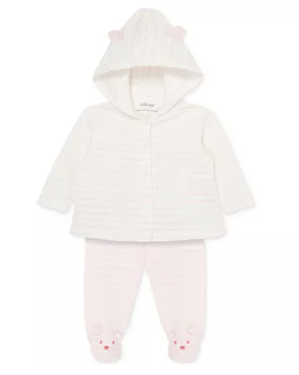 She will be beary cute in this cardigan and footed pant set from Little Me. The cardigan is striped with buttons down the front, and adorable ears on the hood. Finish off baby girl's outfit with the matching striped footed pants.