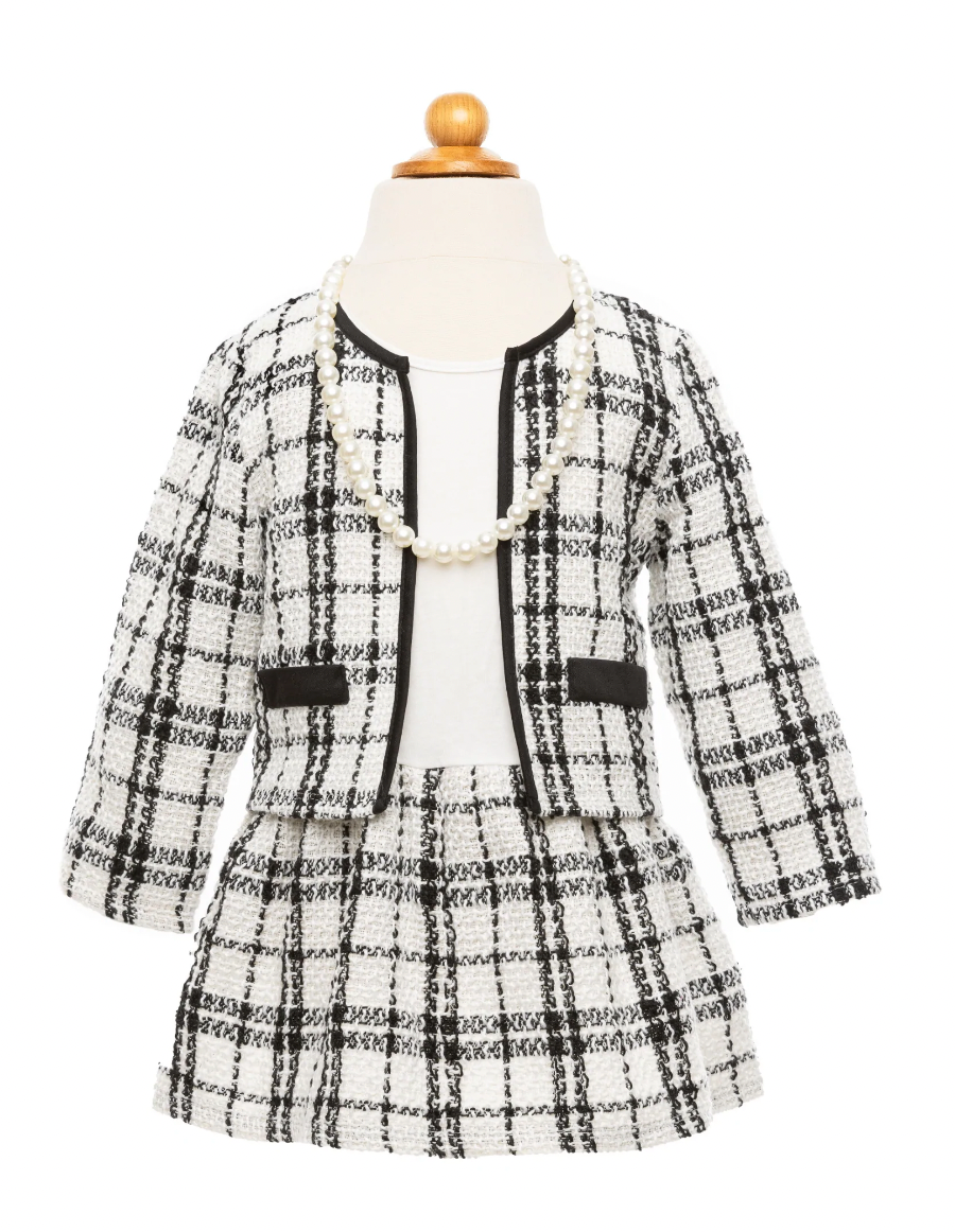 Channel your inner designer with our Coco the Fashionista set. Future fashion icons are sure to look the part in this classic cream & tweed dress and jacket set that is made complete by a strand of pearls.