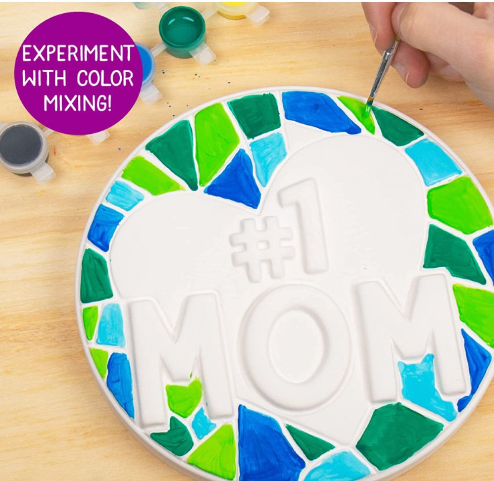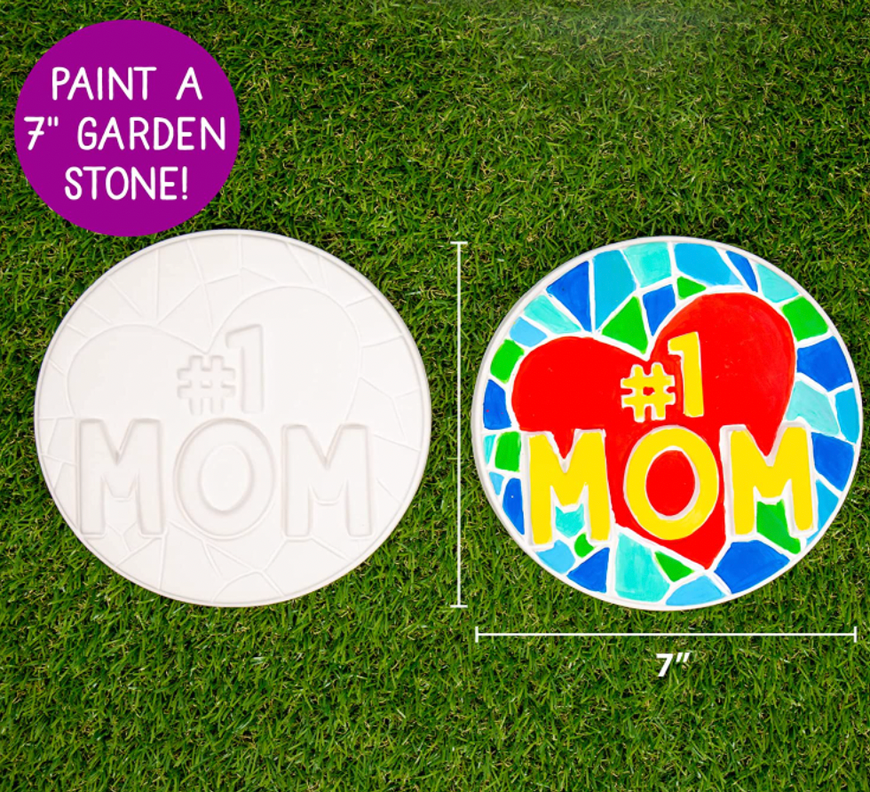 - SET INCLUDES: 1 Pre-Cast Mosaic “#1 MOM” Stepping Stone, 6-Color Acrylic Paint Strip (1 ea. Red, Yellow, Green, Blue, White, Black), Paintbrush, Easy-to-Follow Instructions.