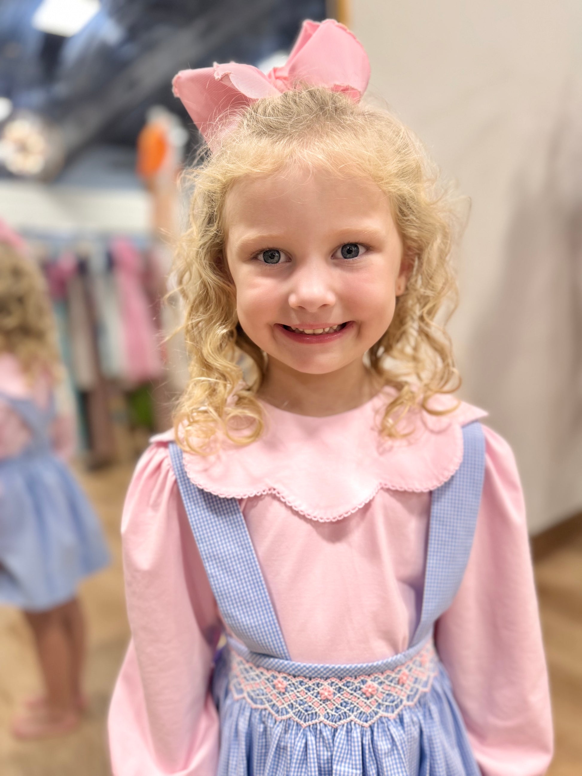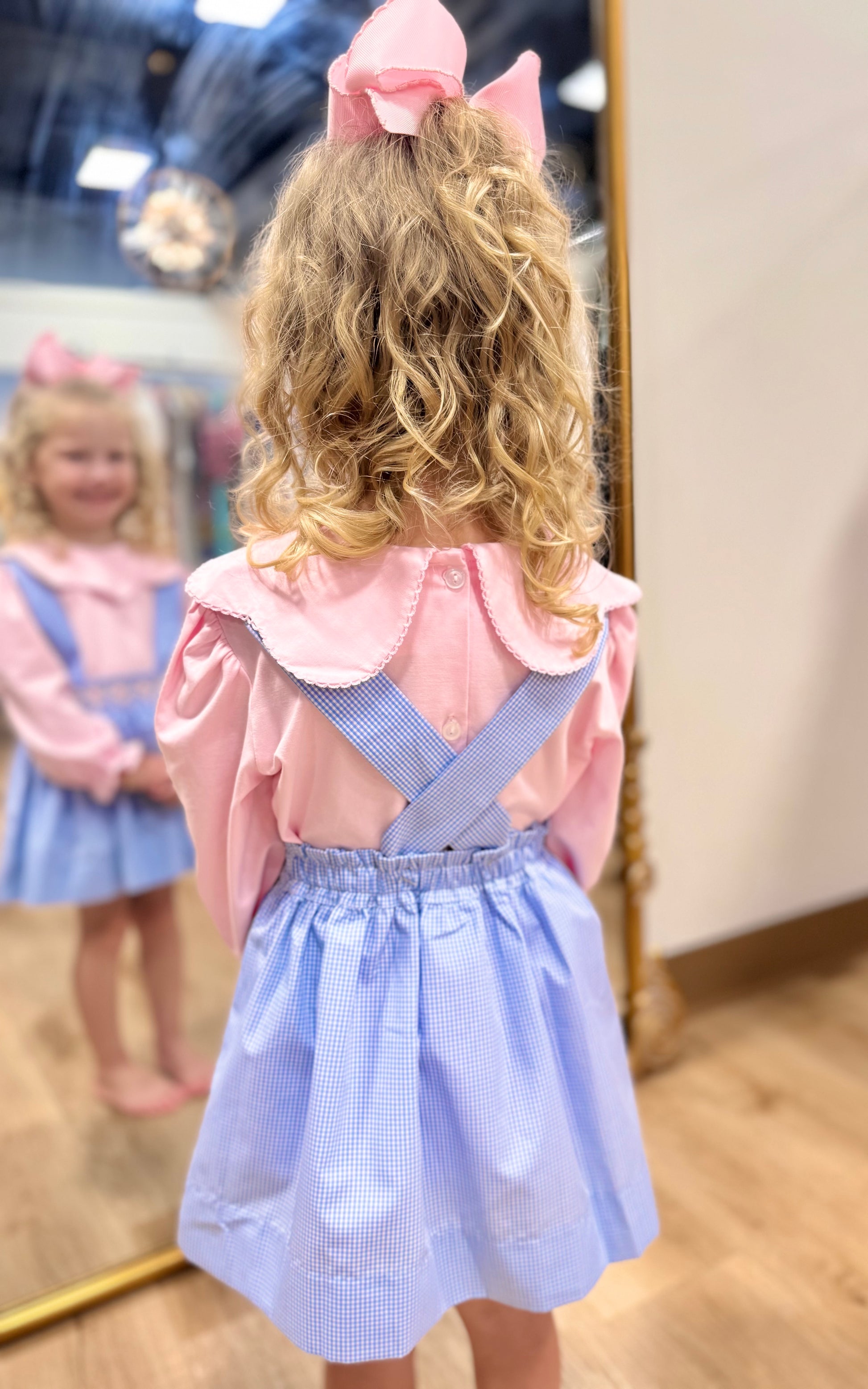 Delaney Girls Blue Gingham Smocked Skirt with Pink Knit Long Sleeve Shirt