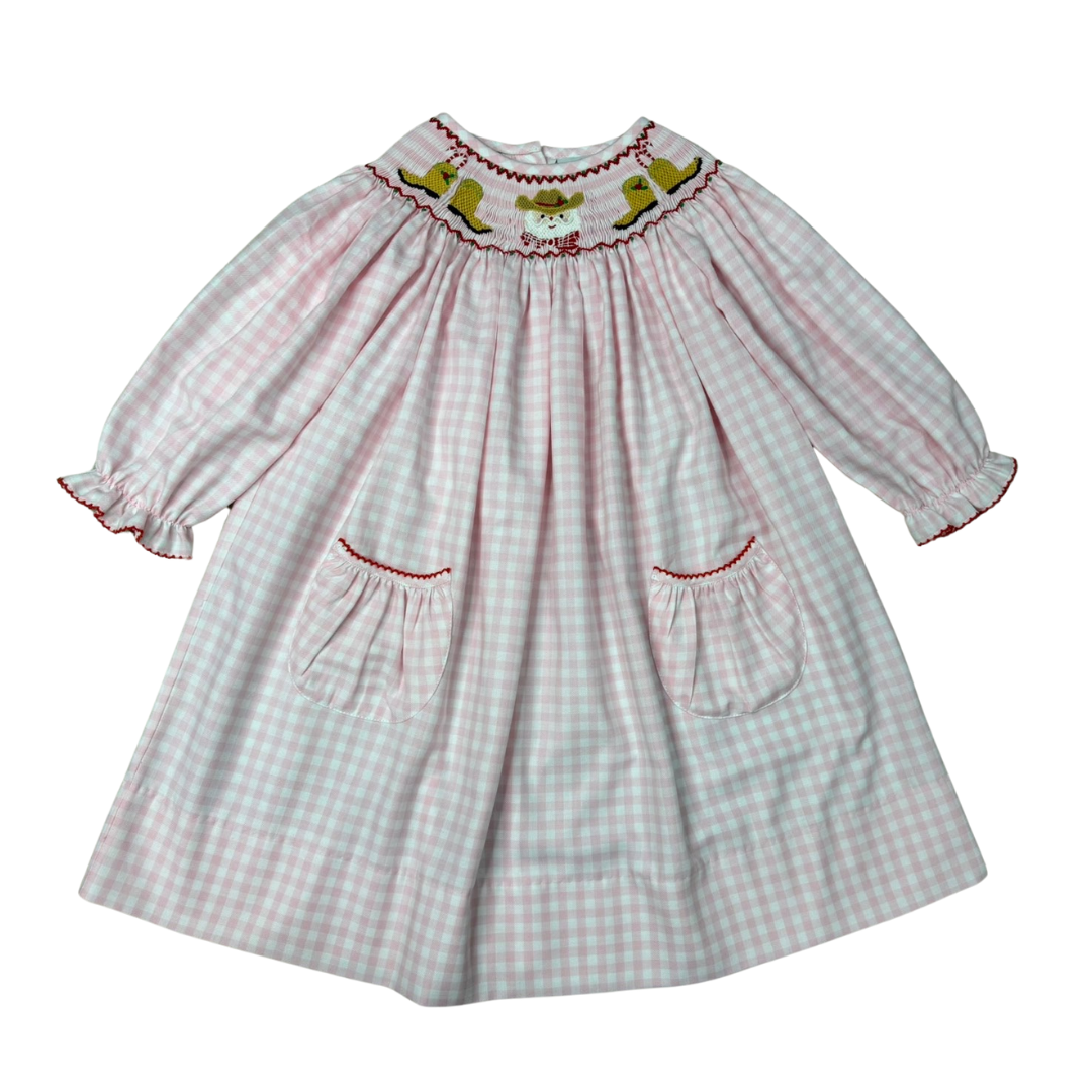 Delaney Pink Gingham LS Smocked Cowboy Christmas Dress