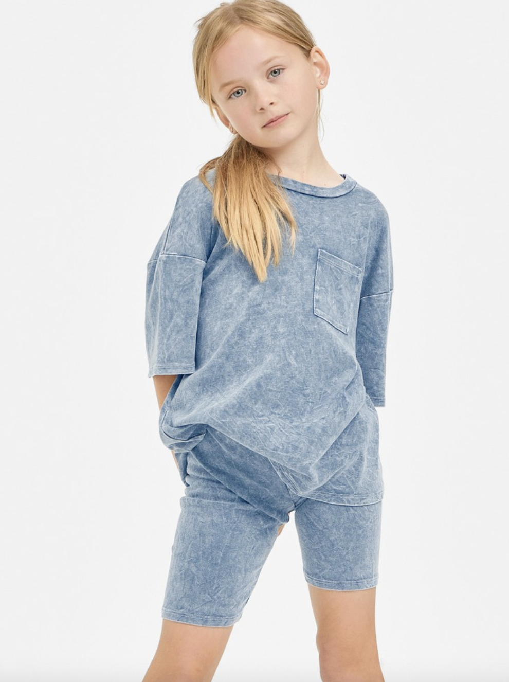 Good Girl Denim Blue Mineral Washed Top and Biker Shorts Set.