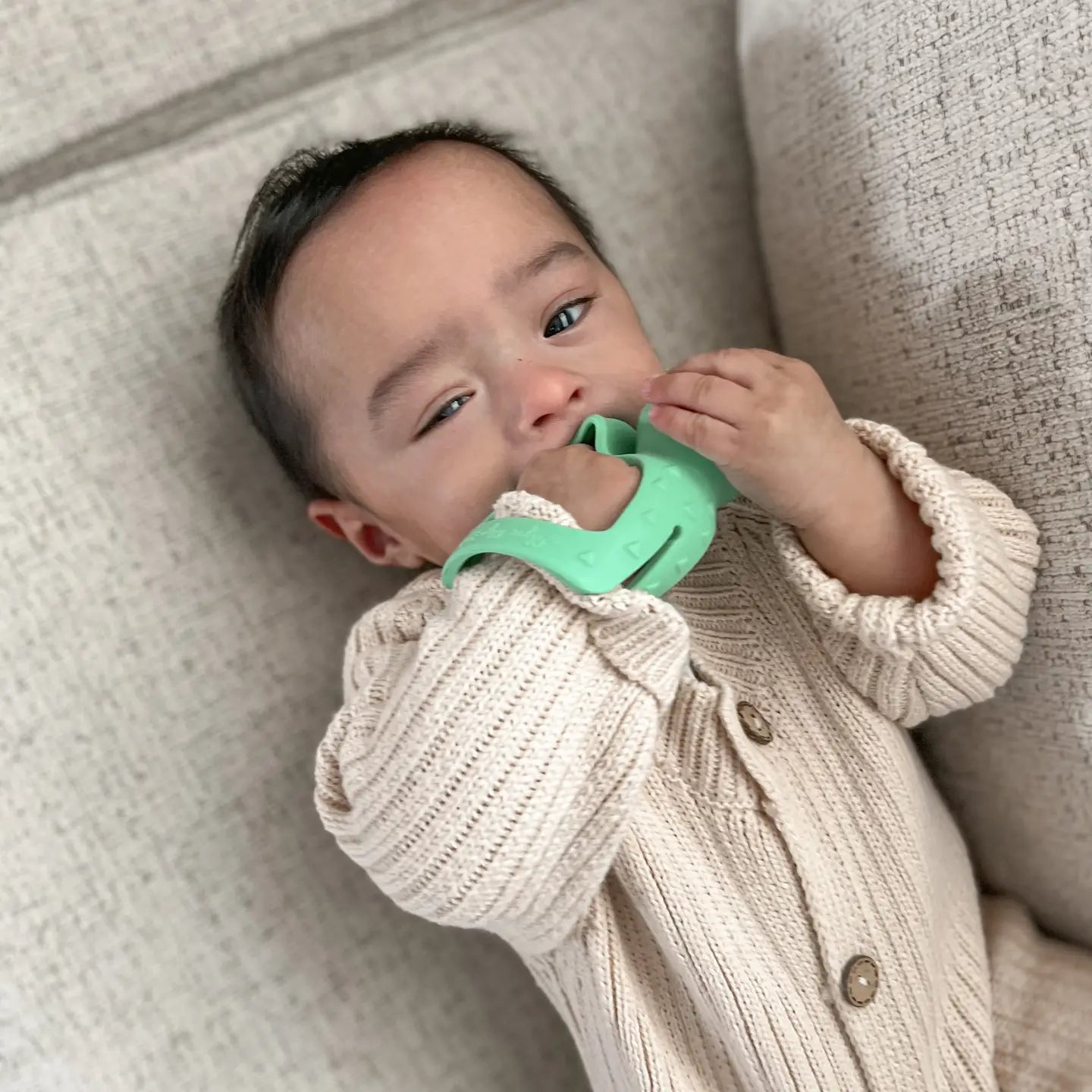 Chew On This! Relief is at hand! Our Bitzy Grip™ developmental teether is designed for baby's natural grasp reflex. Multiple textures and soft flexible silicone provide relief to sore gums at all stages of teething. - Non-toxic food grade silicone - Free of BPA, PVC, phthalates, lead and cadmium - Multi textures help soothe sore gums - Easy to grasp cross-bar works with baby’s natural grip reflex - Easy for baby to hold - Ages 3m+ - Hand wash with mild soap