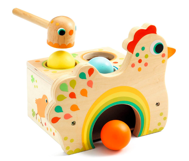 Great for introducing cause and effect and for developing your little one’s motor skills, the Djeco Tapatou Chicken is one adorable wooden hen that will bring endless smiles and laughter. Featuring a mallet that is easy for small hands to grip, your tot will love tapping the balls through the top and watching them roll through the rainbow.