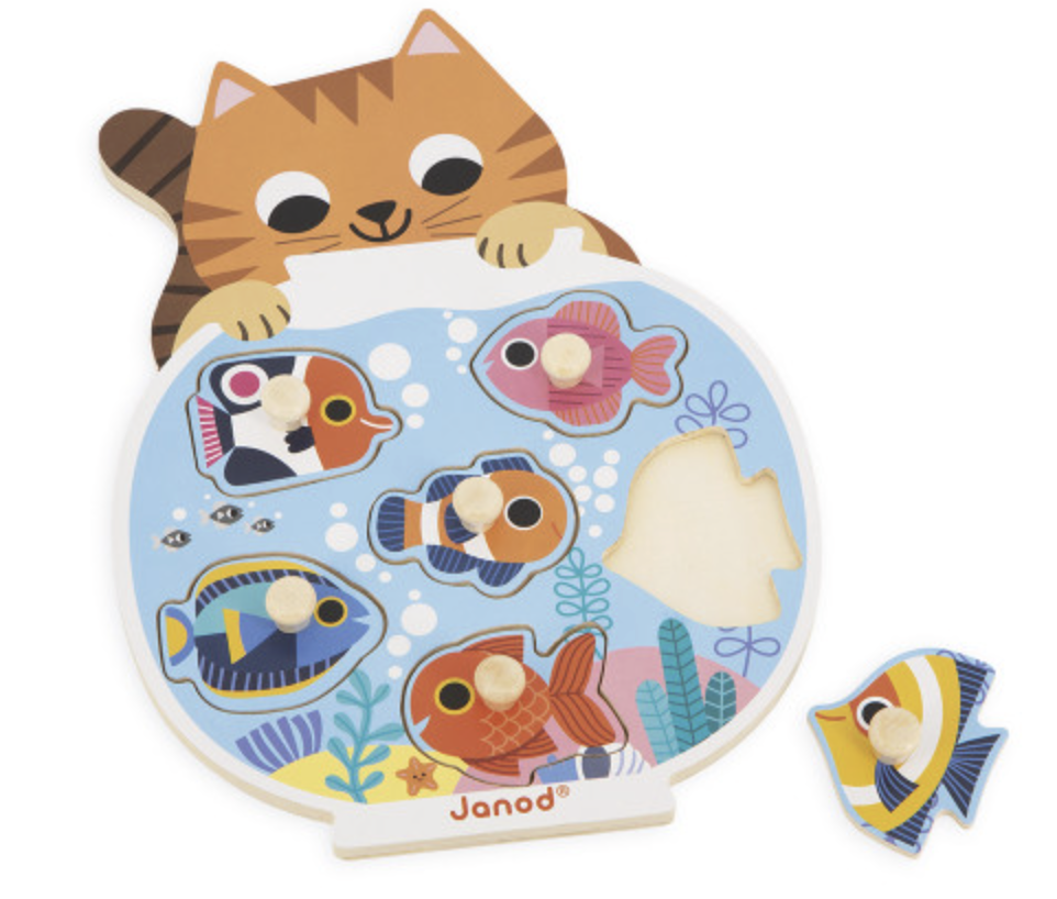 -6 piece puzzle with wooden pegs on puzzle pieces of exotic fish