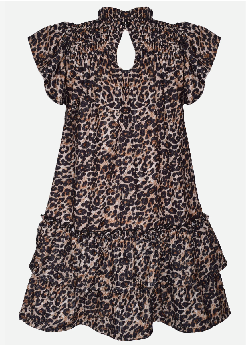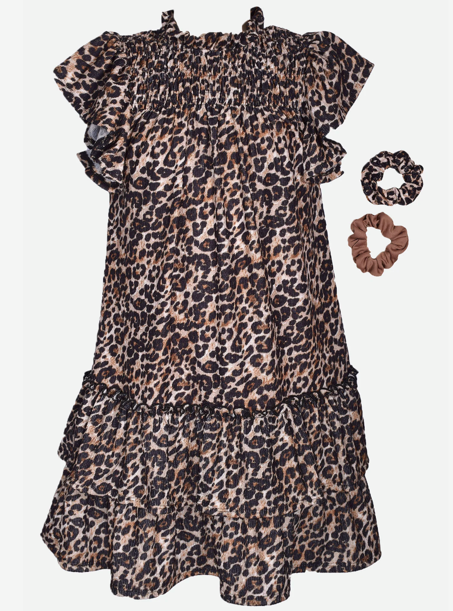 She'll make a statement in this bold animal print knit dress! The smocked yoke adds an elegant touch to this trendy style, which features a tiered skirt and flutter sleeves. Matching scrunchies make this the perfect back-to-school outfit!