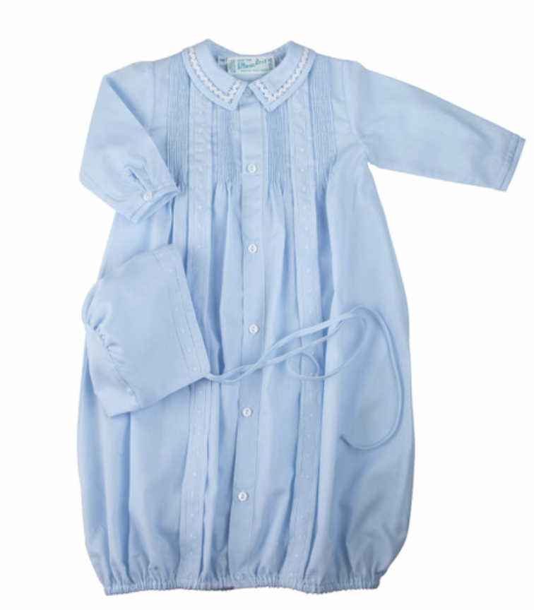 Looking for the perfect thing for your baby boy to make his debut in? This beautiful take me home set is just what you've been looking for with its timeless, vintage style. Ric rac trim lines the pointed collar and delicate fagoting lines the sleeve cuffs. The front is designed with tiny pintuck on the bodice and inverted pleats going down the length of the gown, accented with dainty lace boring and a hand embroidered dot design. Understated and classy, this set is sure to become a family heirloom for years to come! (Includes matching hat)