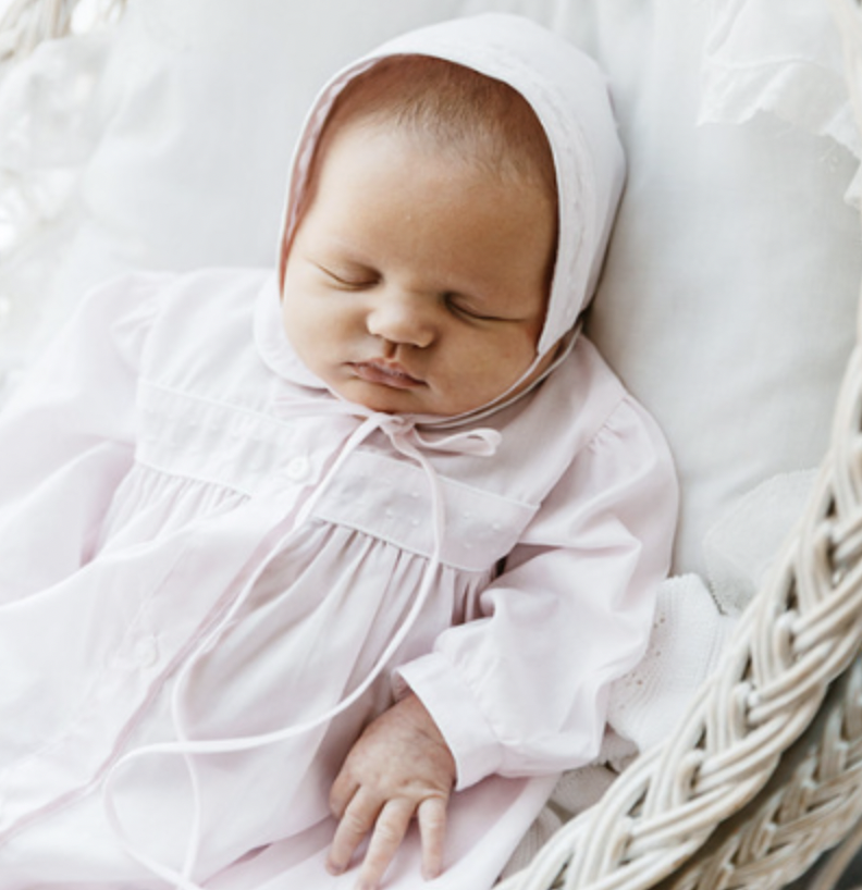 Simple, classy, and sweet - what more could you ask for? This preemie take me home gown for girls is a classic of heirloom-worthy quality coupled with understated class. The set from Friedknit Creations by Feltman Brothers is available in pink on white or white on pink, and either option is sure to please. Contrasting color piping lines the collar and sleeve cuffs for a touch of detail. The top features a panel of dainty dot embroidery bordered with piping, and matching embroidery appears on the collar and hat as well. Sharp pleats cover the length of the gown on either side of the button down center. Whether for your own baby girl or a loved one, the Dot Embroidered Take Me Home Set is sure to become an instant family favorite!