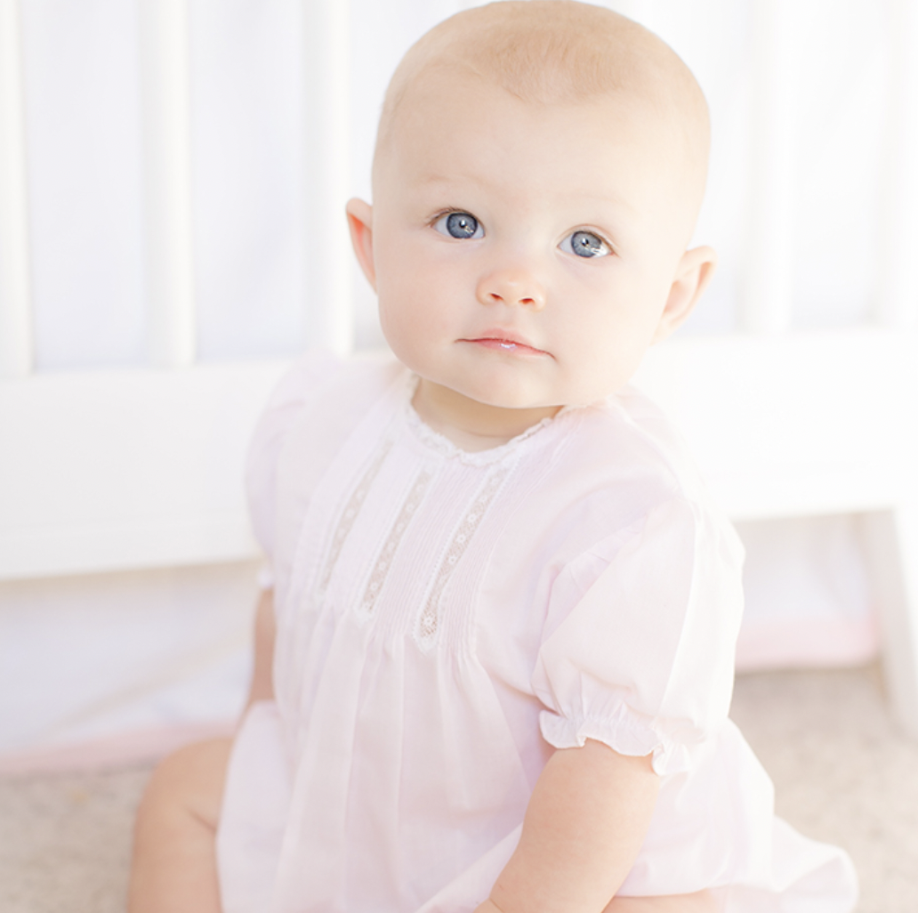 Babies are a precious gift from heaven, pure and angelic. This soft and classy bubble is just the right thing for your little angel to wear on special occasions, holidays, or every day! Elegant French lace graces the neck as well as the bodice, between dainty hand stitched pintucks, opening into soft gathered pleats down the remainder of the piece. Elastic ruffles edge the puffed sleeves and leg holes of this classy, precious bubble. A vintage style outfit for your beautiful baby girl, an heirloom to cherish for years to come.