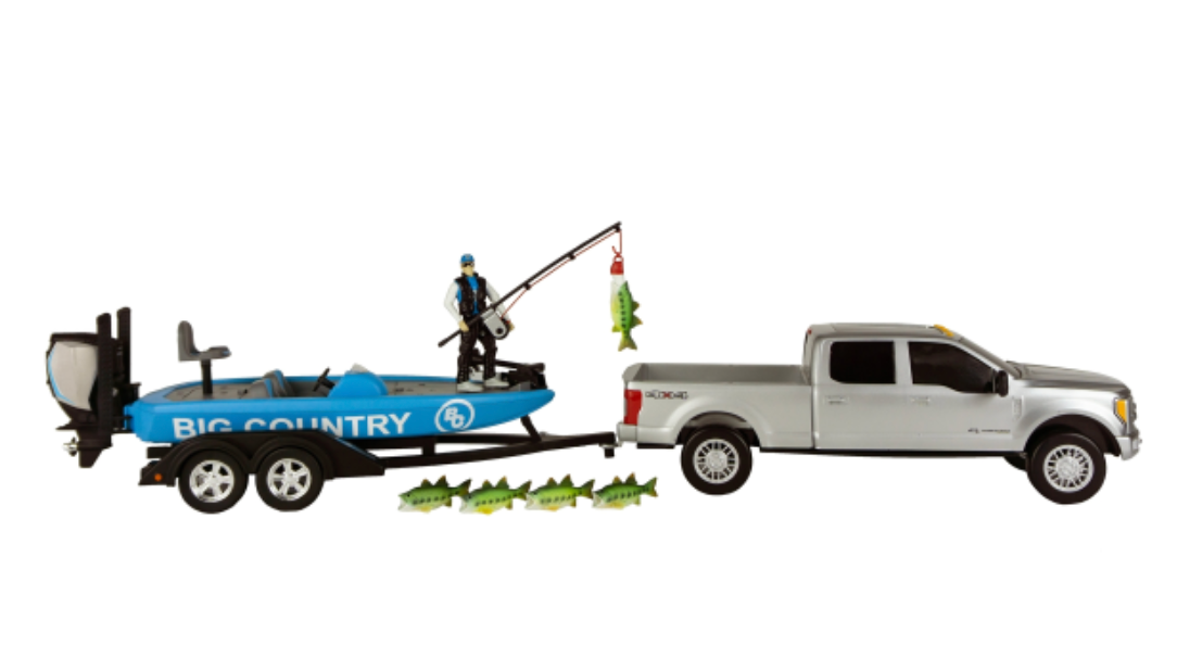 Bass fishing Set is the perfect gift for kids who love to fish. 5 Bass fish, angler fisherman, life-vest, fishing pole, boat trailer, bass boat, and Ford F250 all included. The Ford F250 Super Duty features 2 peg-and-hole connectors, 1 in the bed and 1 under the bumper, to pull our full line of farm, rodeo, and outdoor trailers. The Bass Boat features a motor, trolling motor, 1 live-well, and a swivel chair that can be attached on the back deck.