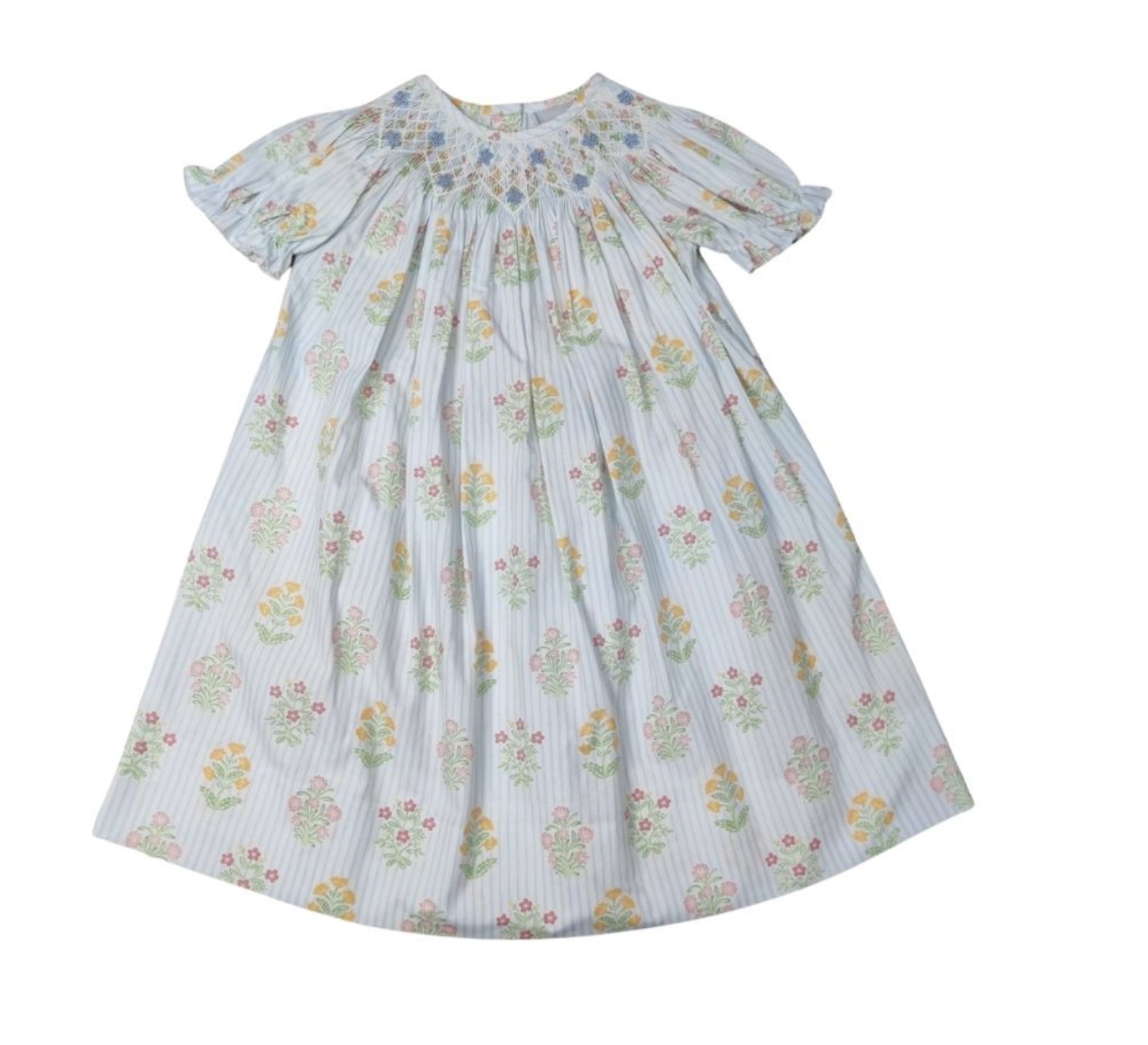 Girls Blue Stripe Floral Fabric SS Bishop Dress.