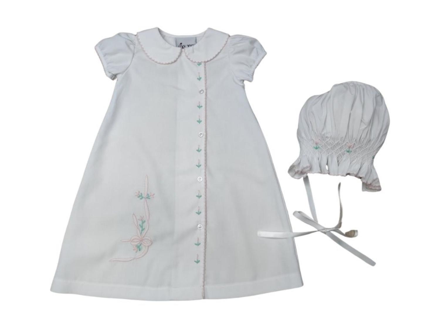 Girls White Side Button Shadow Pink Bow Daygown & Bonnet