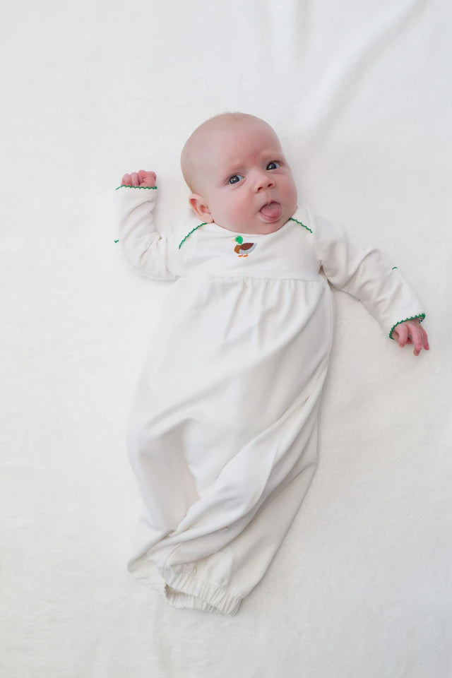 The gown features delicate picot trim along the neckline and scratch mitts for a subtle pop of color and timeless detail. Our exclusive embroidered icons add a playful, heirloom-inspired touch. The gathered yoke creates a relaxed, roomy fit, while the elasticized bottom allows for quick and easy diaper changes—perfect for busy parents and sleepy snuggles.