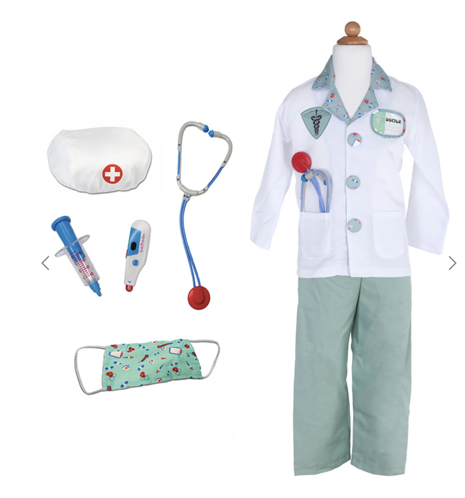 The doctor is in! Look the part in this complete ensemble as you diagnose and treat pretend patients with this 8 piece dress-up-and-play set. The set includes a white doctor's coat, green scrub pants, a green fabric mask, white hat, play stethoscope, play syringe, and play thermometer. The coat also features a sewn in doctor's name tag holder with removable name tag and Velcros on and off. All our Great Pretenders Career Costumes are packaged in a reusable blue garment bag for easy storage. 8 Piece Set: Lab coat, pants, mask, hat, stethoscope, syringe, name tag and thermometer.