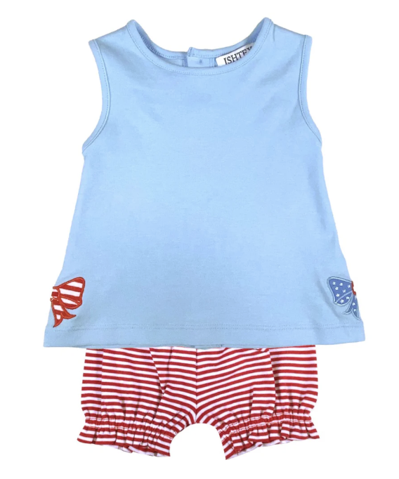 Patriotic bloomer set with embroidered bows on the sides of the shirt. Light Blue Sleeveless shirt with Red/White/Blue bows and Red and White striped bloomers. Top buttons up back for easy changing.