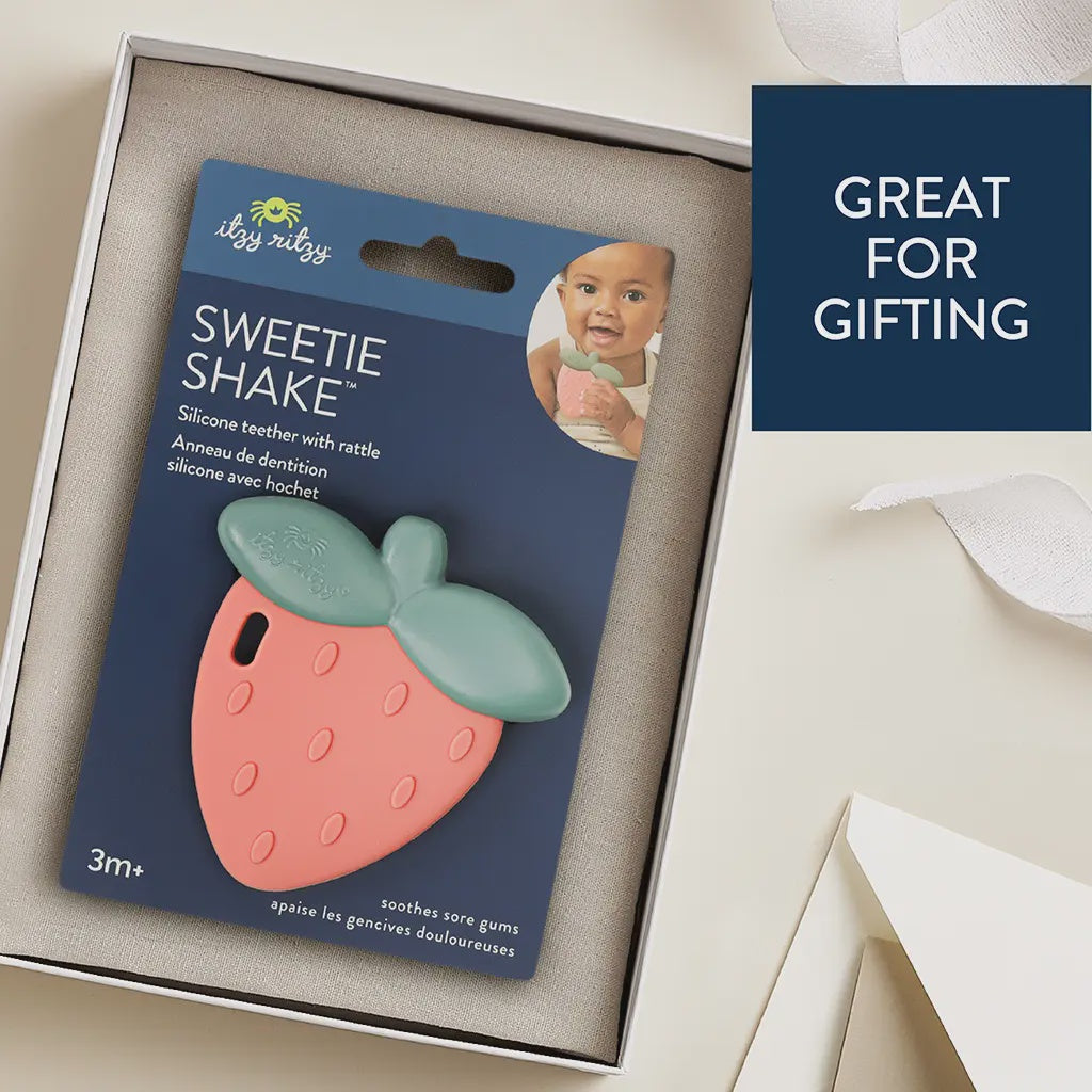 Shake, Rattle & Teethe! Shake off those teething blues with the Sweetie Rattle™ silicone teether. Made of soft, flexible silicone, this engaging rattle features multiple textures to soothe sore gums along with gentle rattle sounds to teach cause-and-effect.