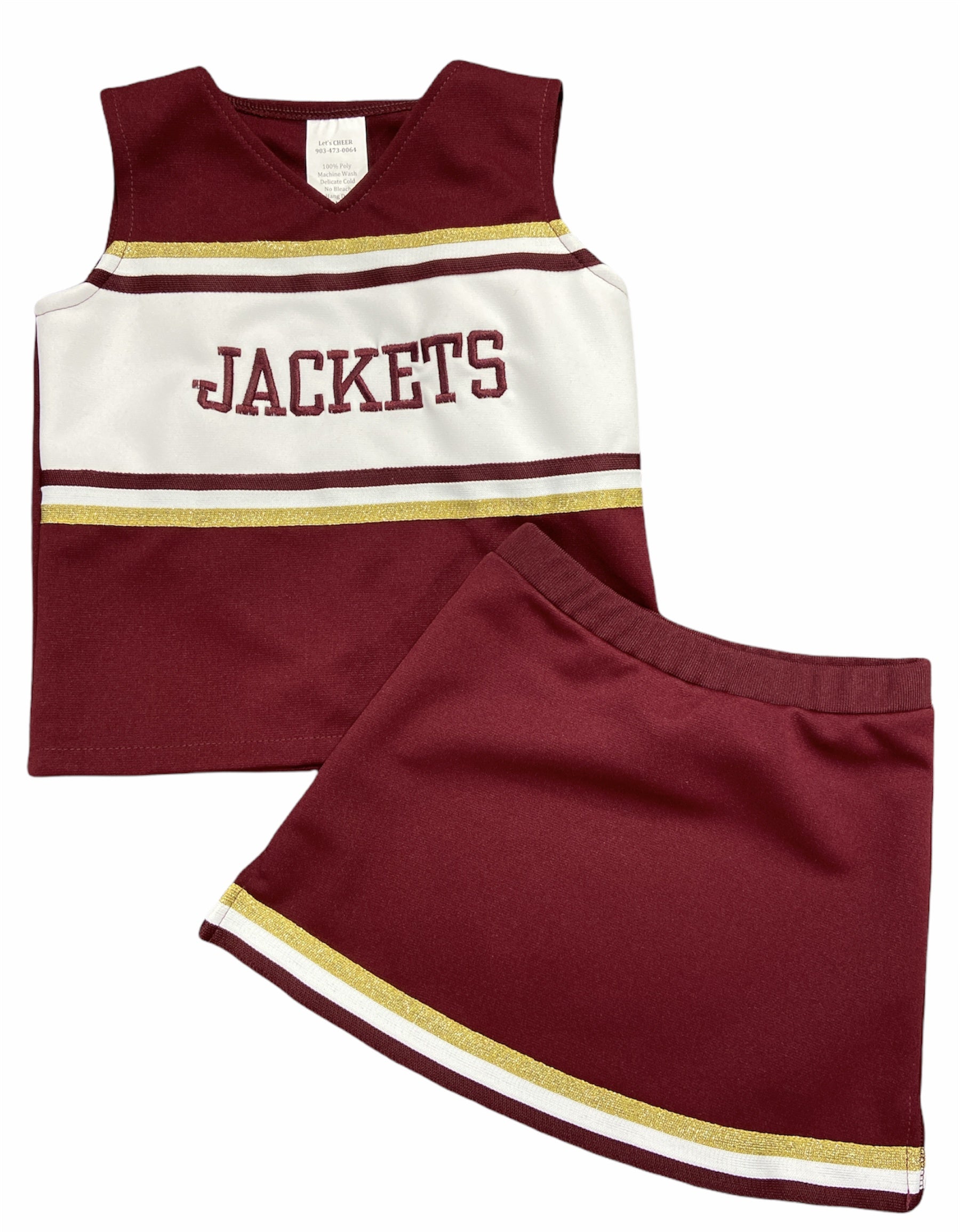 MAROON AND GOLD CHEERSUIT WITH JACKETS MONOGRAM.