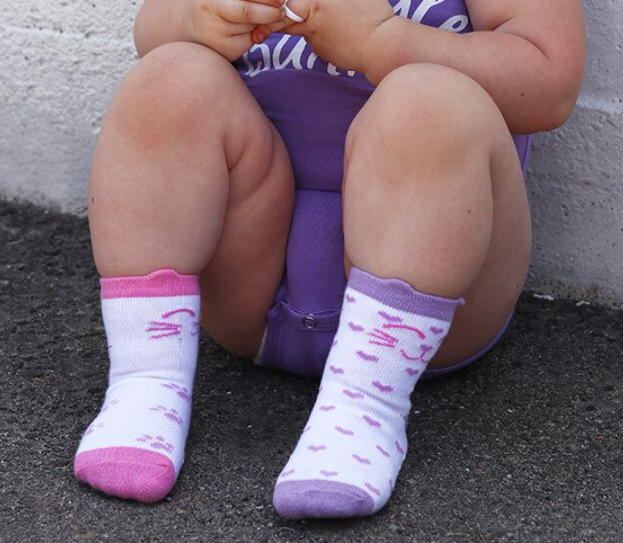 Colorful girls infants and toddlers fashion pattern kitty cat crew socks. Special knit top with 3-D knit cat ears. Each sock features no slip non-skid grippers to help new walkers prevent slips and falls. Made with soft durable cotton with more stitches per inch with just the right amount of stretch to conform to baby's foot to keep socks snug and in place so they don't slip off.
