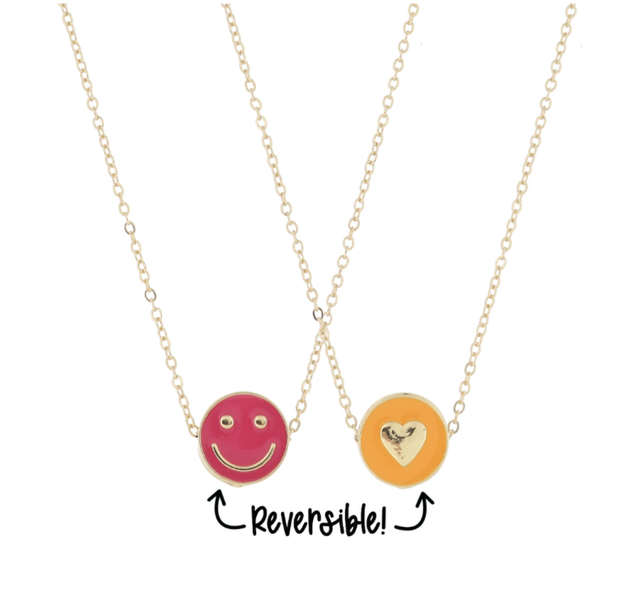 Kids Reversible Disc W/ Hot Pink Enamel Happy Face And Orange Enamel Heart Necklace
