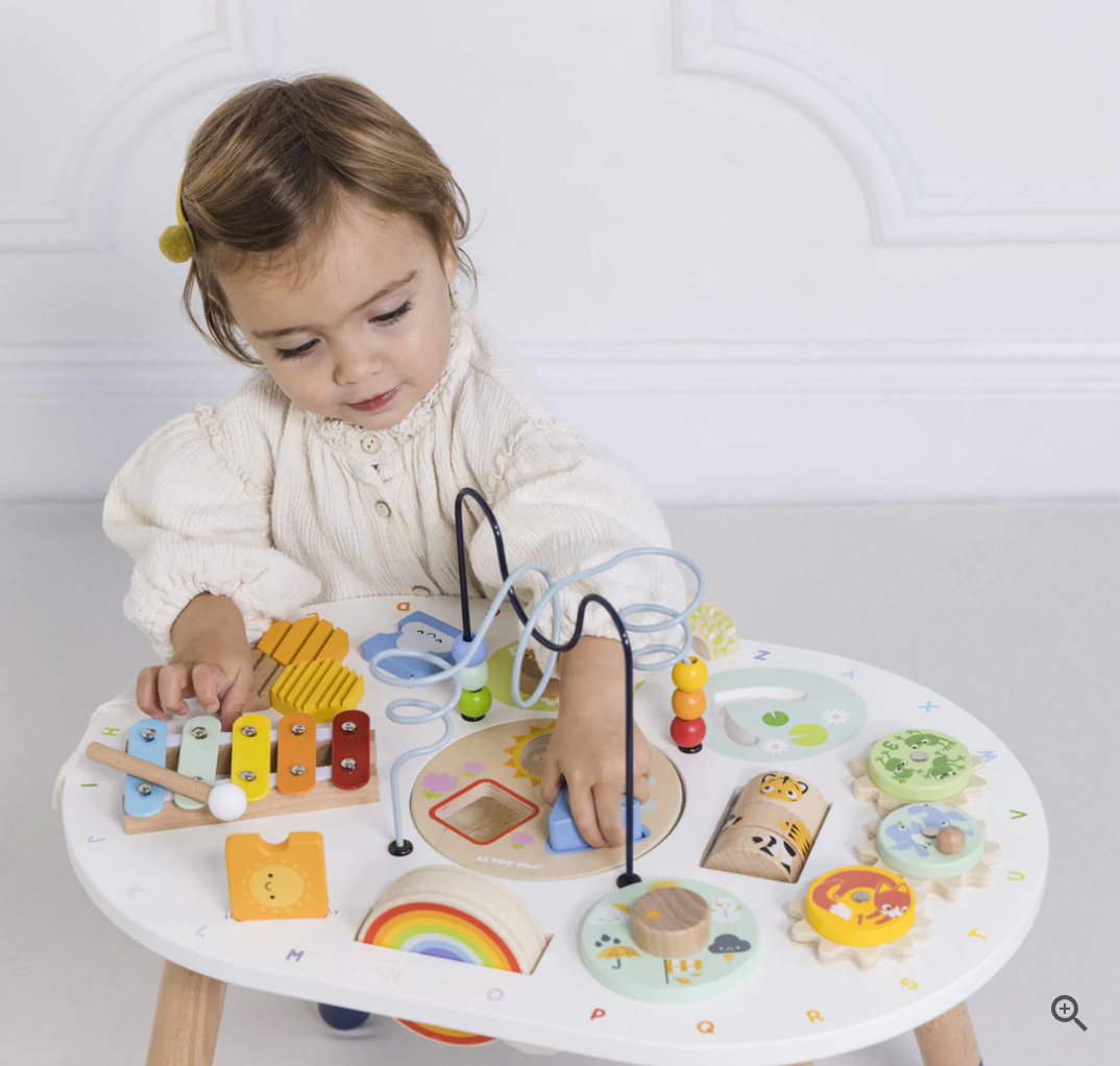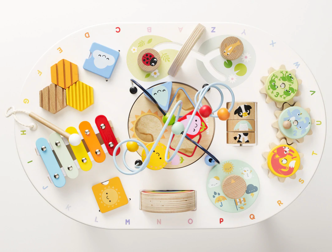 - Explore the centrepiece bead maze with a shape sorter underneath