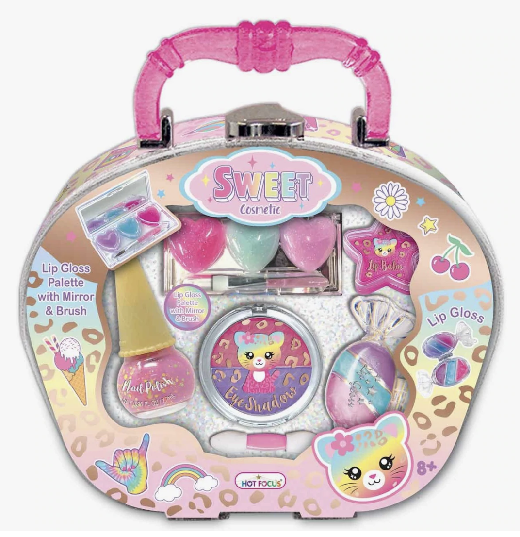 Lip Gloss Palette with Mirror & Brush. 1-Lip Gloss Palette, 1-Brush, 1-Eyeshadow Palette, 1- Eyeshadow Applicator, 1-Scented Nail Polish, 1-Candy Lip Gloss, 1- Lip Gloss.