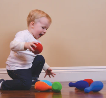 A colorful six pin bowling set made from foamed natural rubber. It's squishy and safe for babies and toddlers. The tactile texture makes it fun to hold and engages kids in active play.