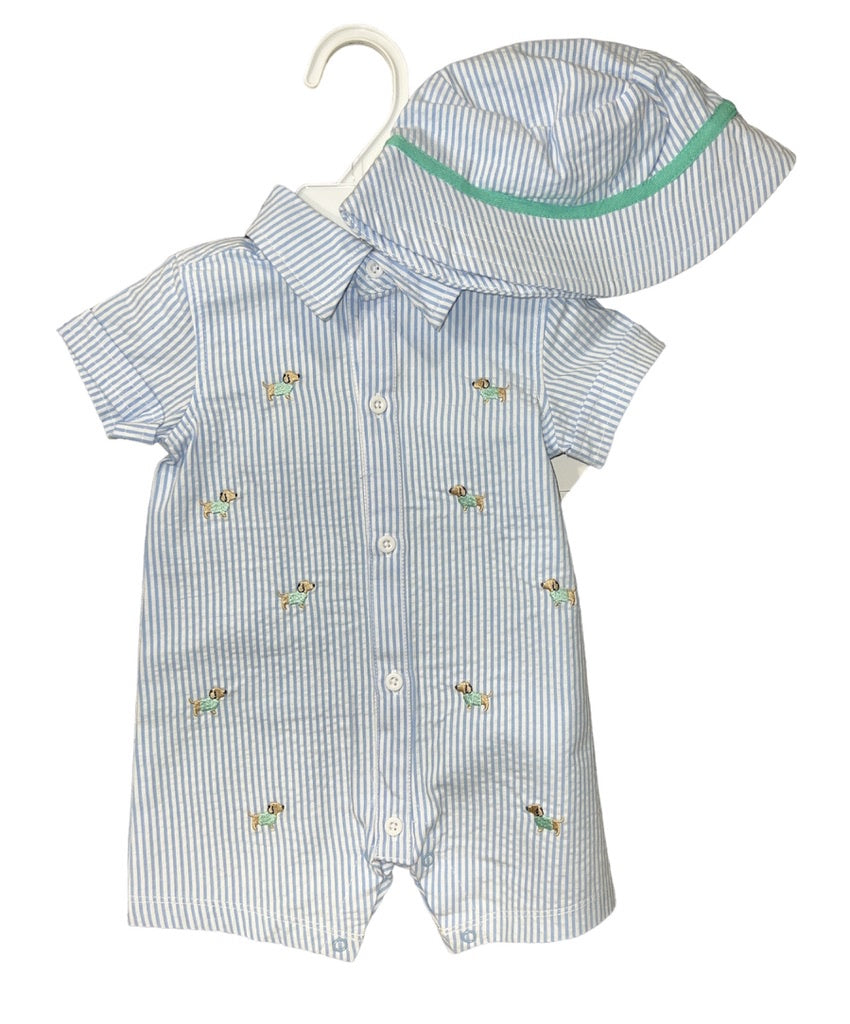 Little Me Signature Luxury Collection Seersucker Dog Romper with Hat.