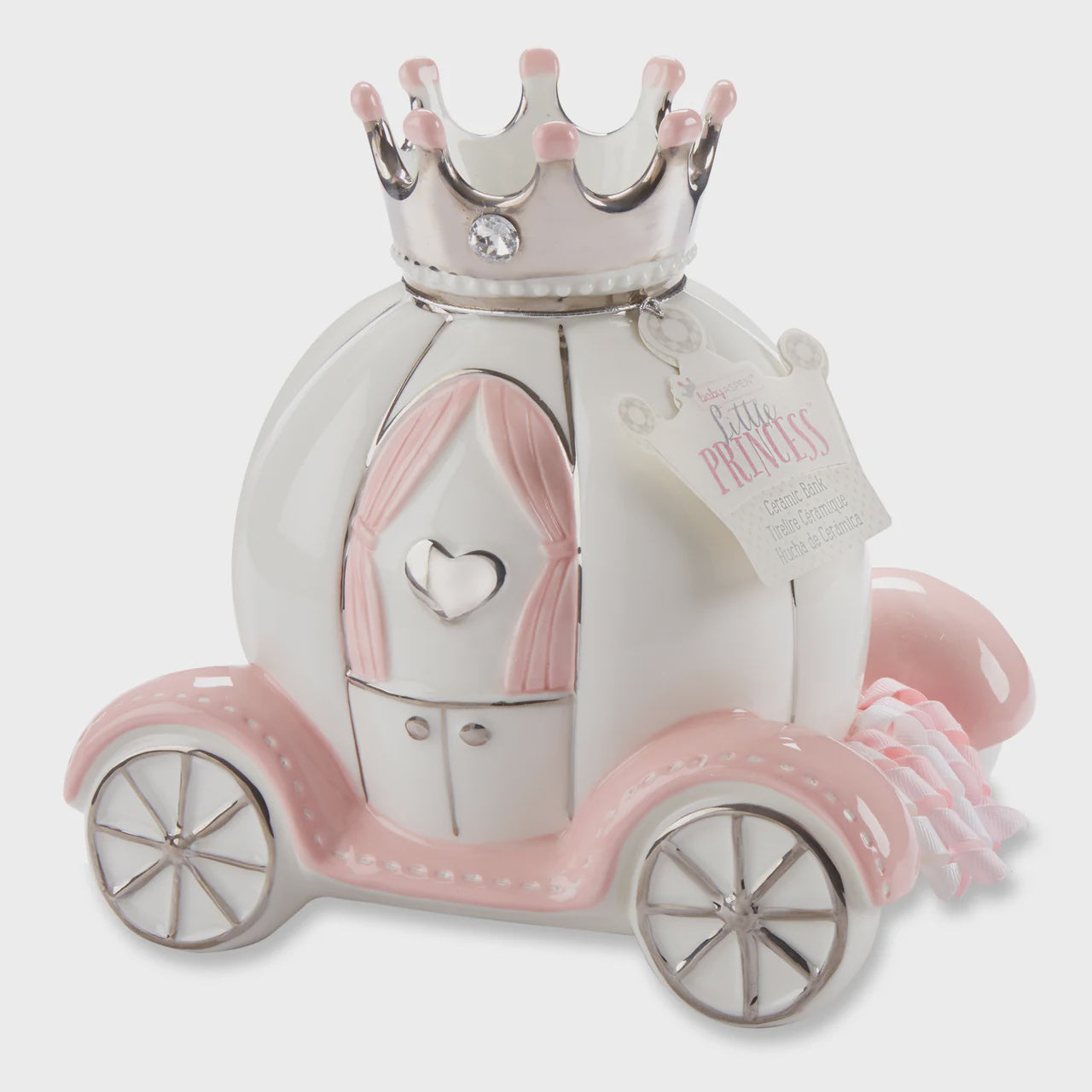 - 100% surface-washable Porcelain carriage-shaped bank is white with pink and silver detailing.