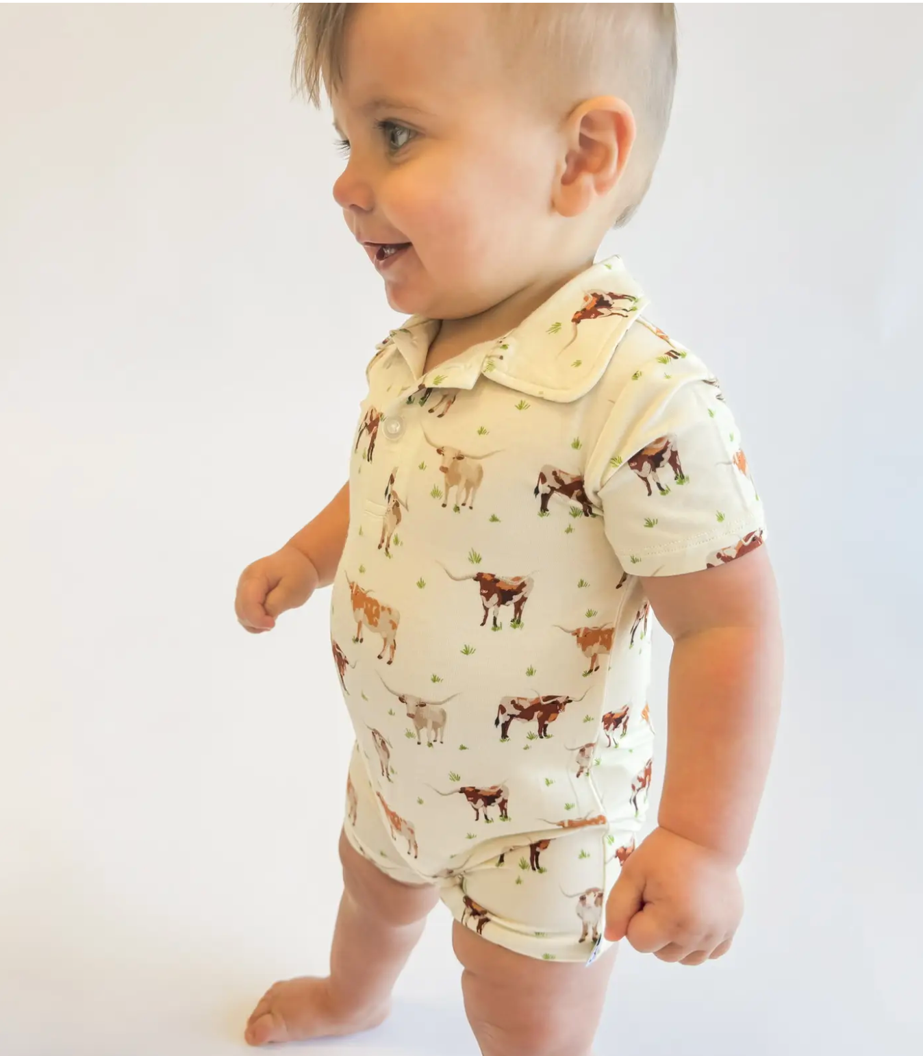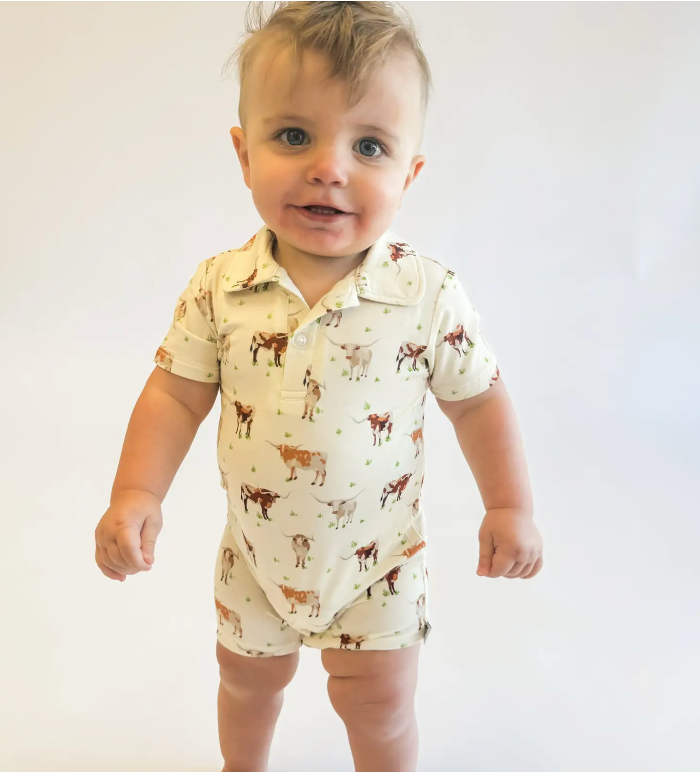 Our Short Sleeve Polo Rompers are the perfect combination of a classic style and comfort. 95% bamboo from viscose, 5% spandex. Tagless. Machine wash cold on gentle with like colors. Tumble dry low, if needed.