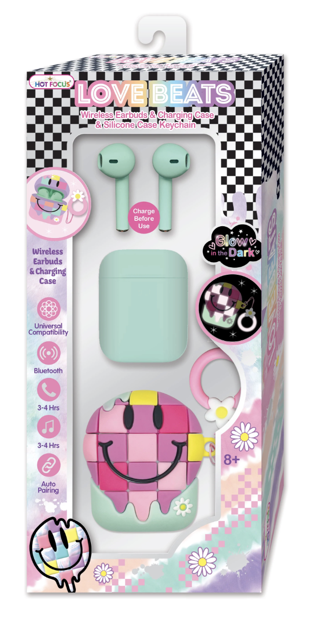 This love beats set includes 1 pair of wireless earbuds, 1 charging case, 1 cute protective case cover that glows in the dark, 1 charging cable, and 1 instruction manual!