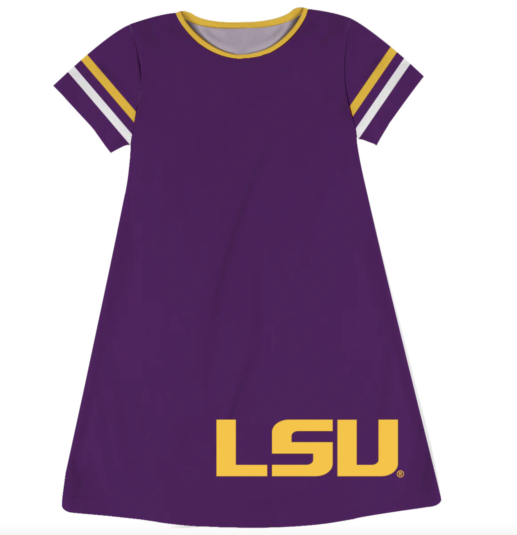 Let your little one celebrate on game day with our LSU Big Logo Purple Stripes Short Sleeve A Line Dress an Officially licensed product from Vive La Fete Collegiate A Line dress