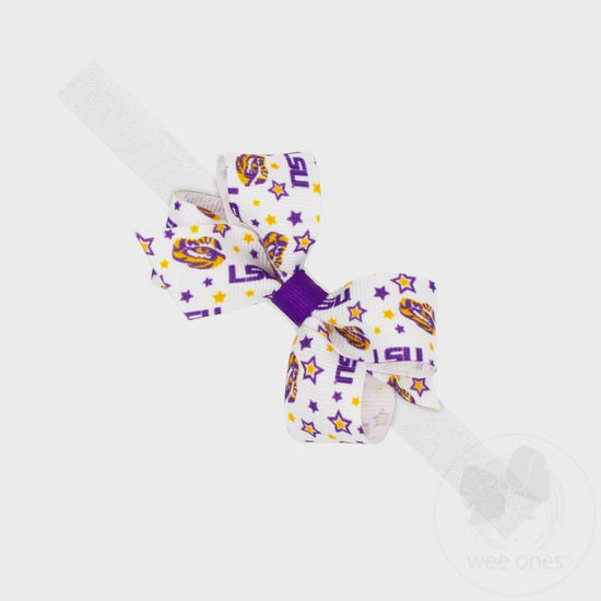 Show your team spirit by wearing this officially licensed collegiate hair bow from our Game Day Collection. This signature collegiate logo print grosgrain hair bow comes on a 5/8 inch soft, stretchy elastic band. Fits 3 months and up. Mini Signature Collegiate Logo Print grosgrain Hair Bow on Elastic Baby Band.