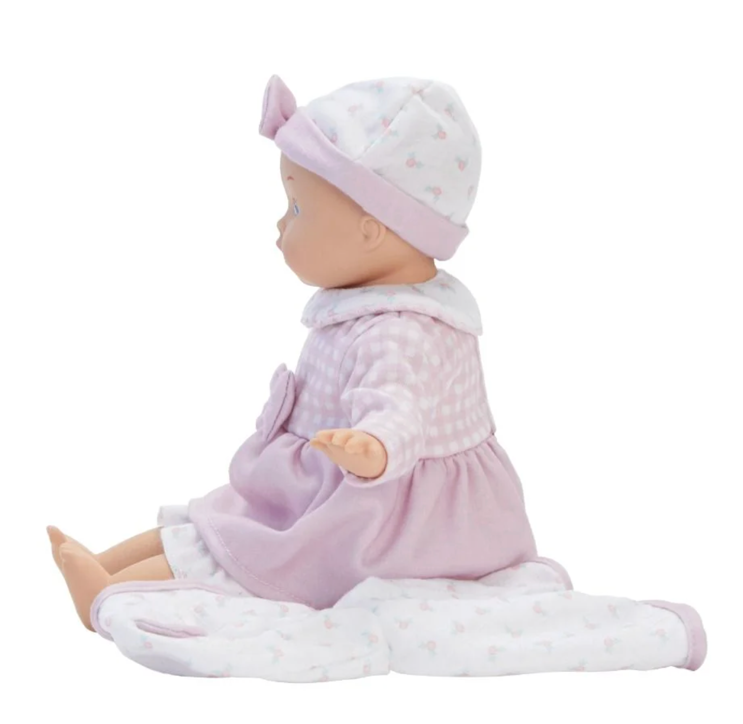This 12" Sweet Baby Nursery - Blossoms & Bows doll is perfect for your little one to hold and to have years of play with! This light skin tone with blue eyes baby wears a darling lavender gingham print dress with ruffled floral pants, and a floral hooded jacket with teddy bear ears! Outfit also includes a matching hat with a bow. She is crafted with baby-safe materials, a molded heads and limbs, painted features, and a soft, cuddly fabric body that is made with love!