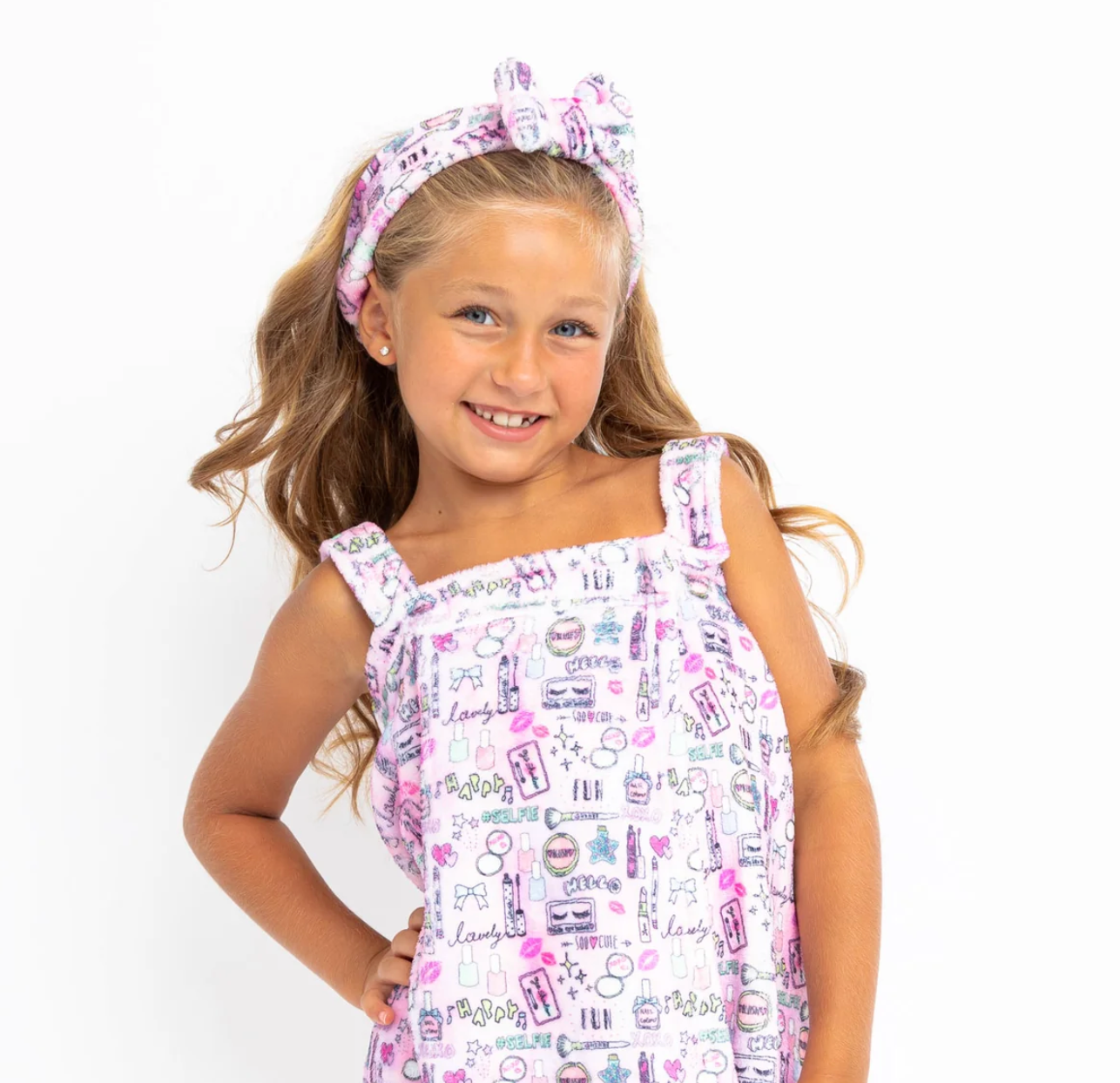 This girls plush spa headband is the perfect addition to your daily beauty routine. Made from soft, luxurious plush fabric, it gently holds back your hair while you cleanse, apply makeup, or lounge around in its matching robe. Say hello to a spa-like experience with our adorable bow-accented headband in this exclusive Makeup print.