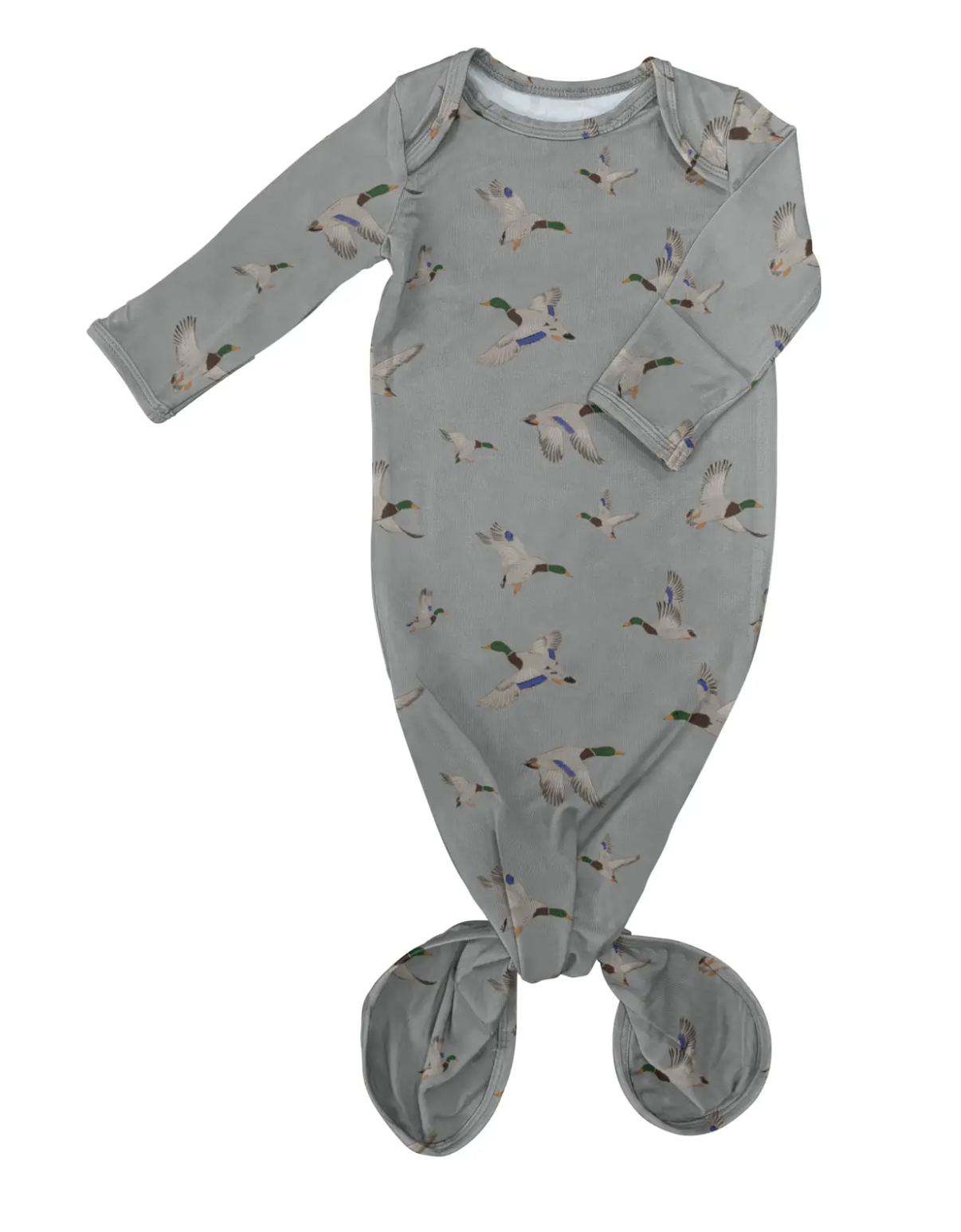 95% bamboo, 5% spandex Knotted infant gown with foldable scratch mitts available in newborn and 0-3 months. Machine wash gentle with like colors. Tumble dry on low, if needed.